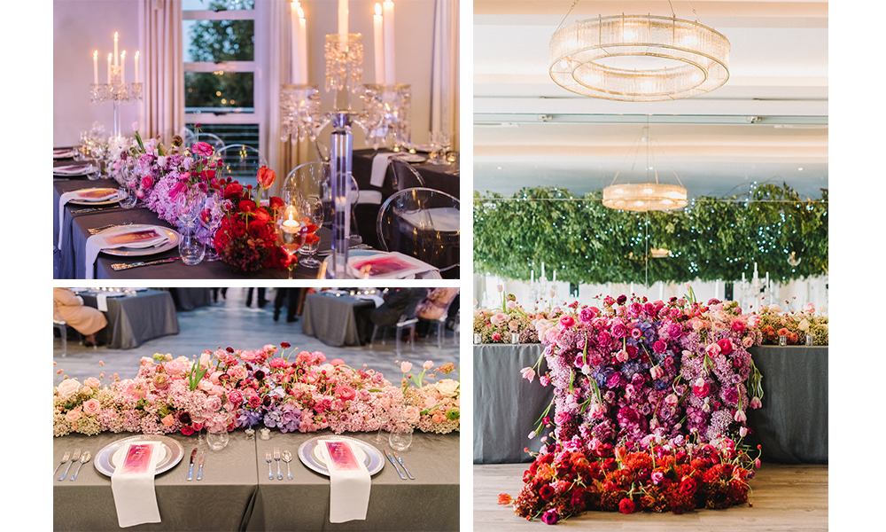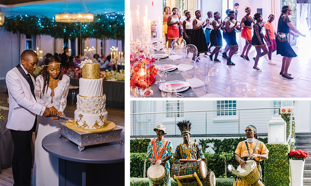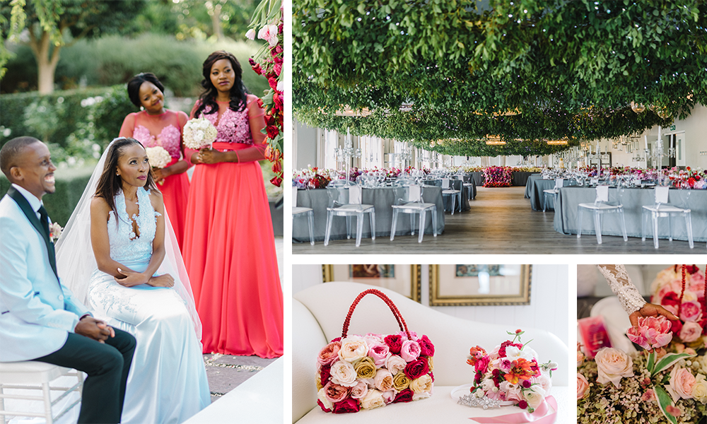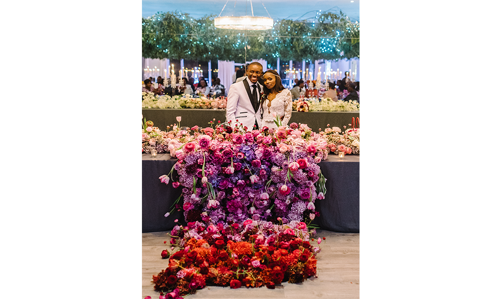 As stated by Elfi Bösinger; “Previously, we have been incorporating ombré colour palettes in different ways. However, for Thato and Nomaswazi’s vibrant wedding we chose not to opt for a soft blend colour palette for a reason. The special pair were truly a happy and cheerful couple who did not shy away from incorporating vivacious colours within their wedding décor. Since the couple could not decide on a statement colour, we suggested using an electric set of colors to bring out their jovial personalities as we believe that every wedding has to reflect the unique traits of the bride and groom. We also draped the vast walls and ceilings with eucalyptus twigs, fragrant garden roses and created tinted ombré table centerpieces. Organising a local South African dance group to perform its heart out for the beautiful couple and their family and friends was a difficult task at hand, but as luck would have it, it went smoothly and even turned out to be the highlight of the night!”.