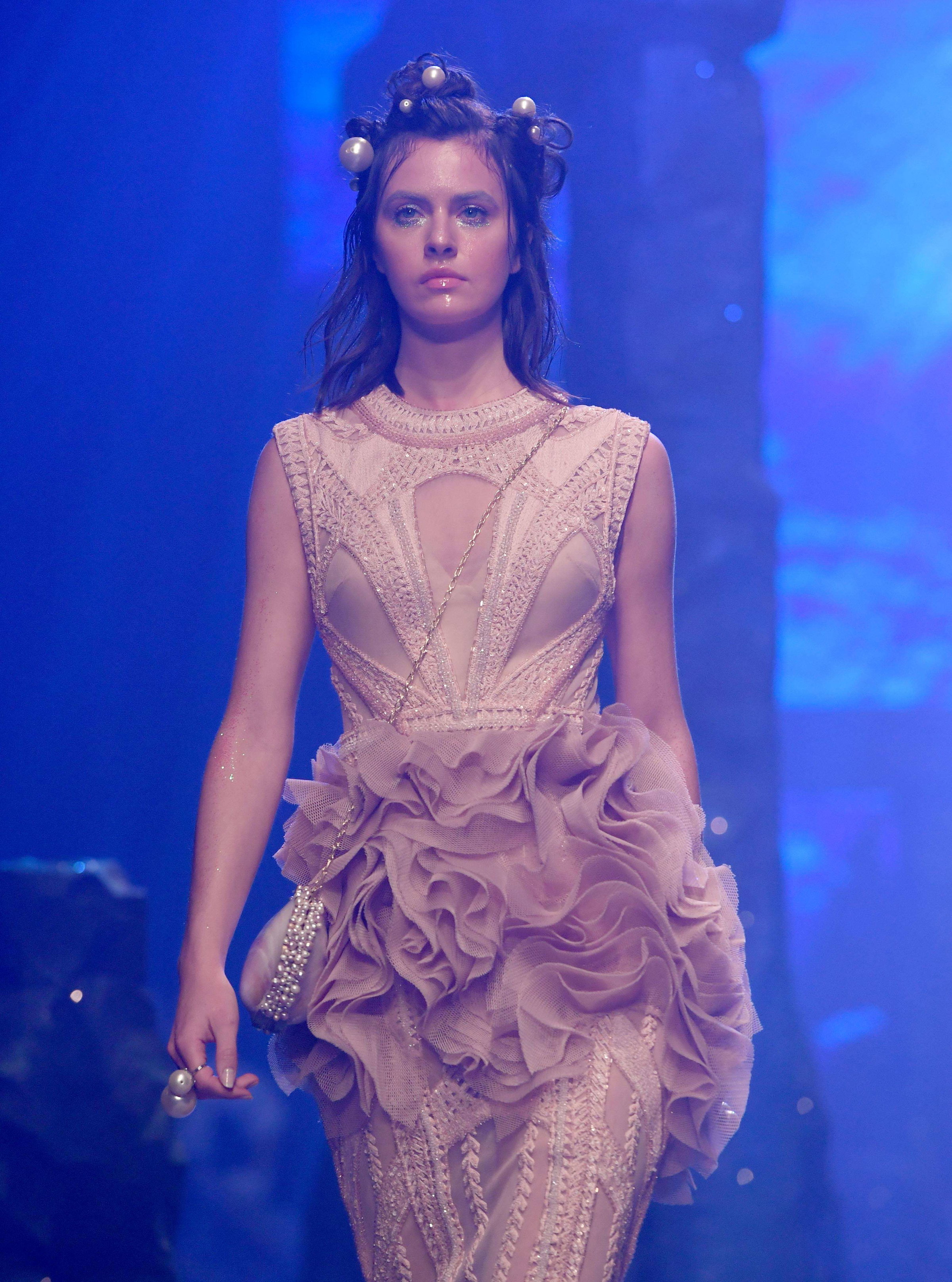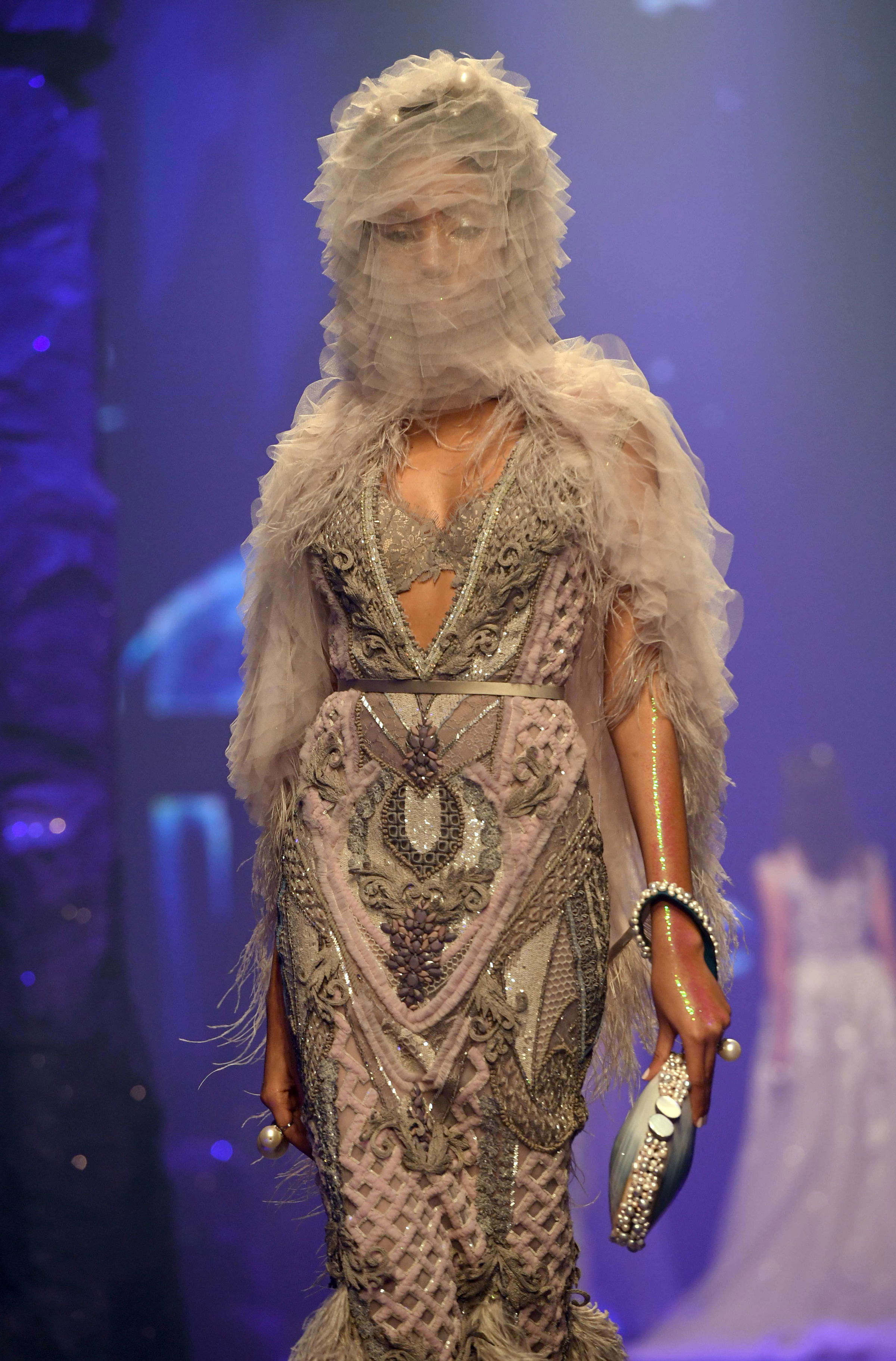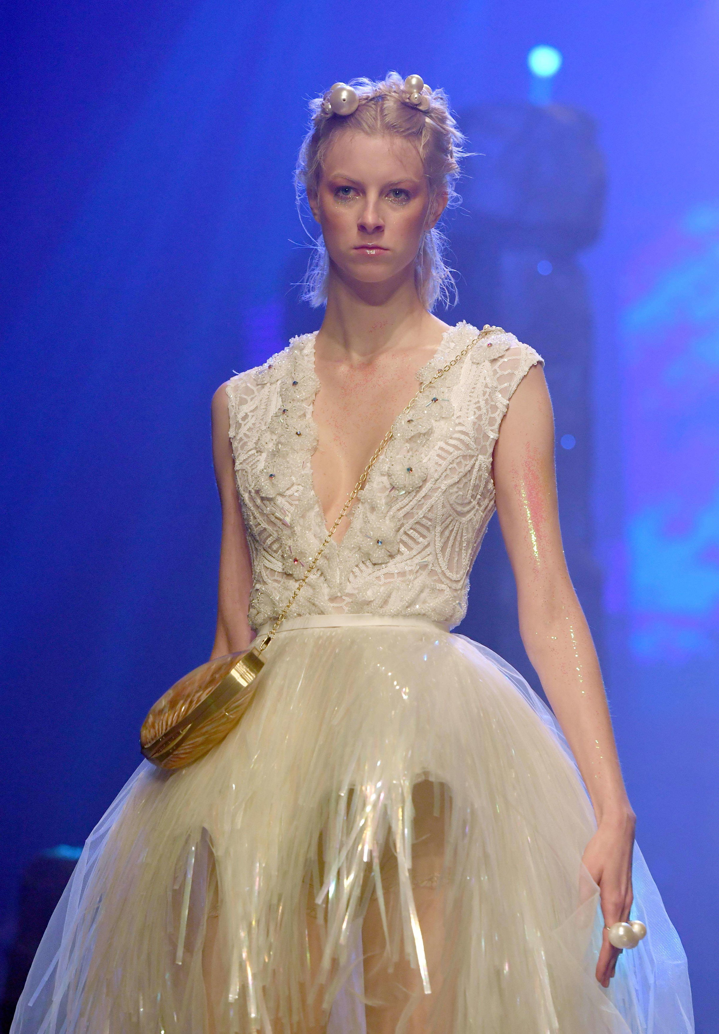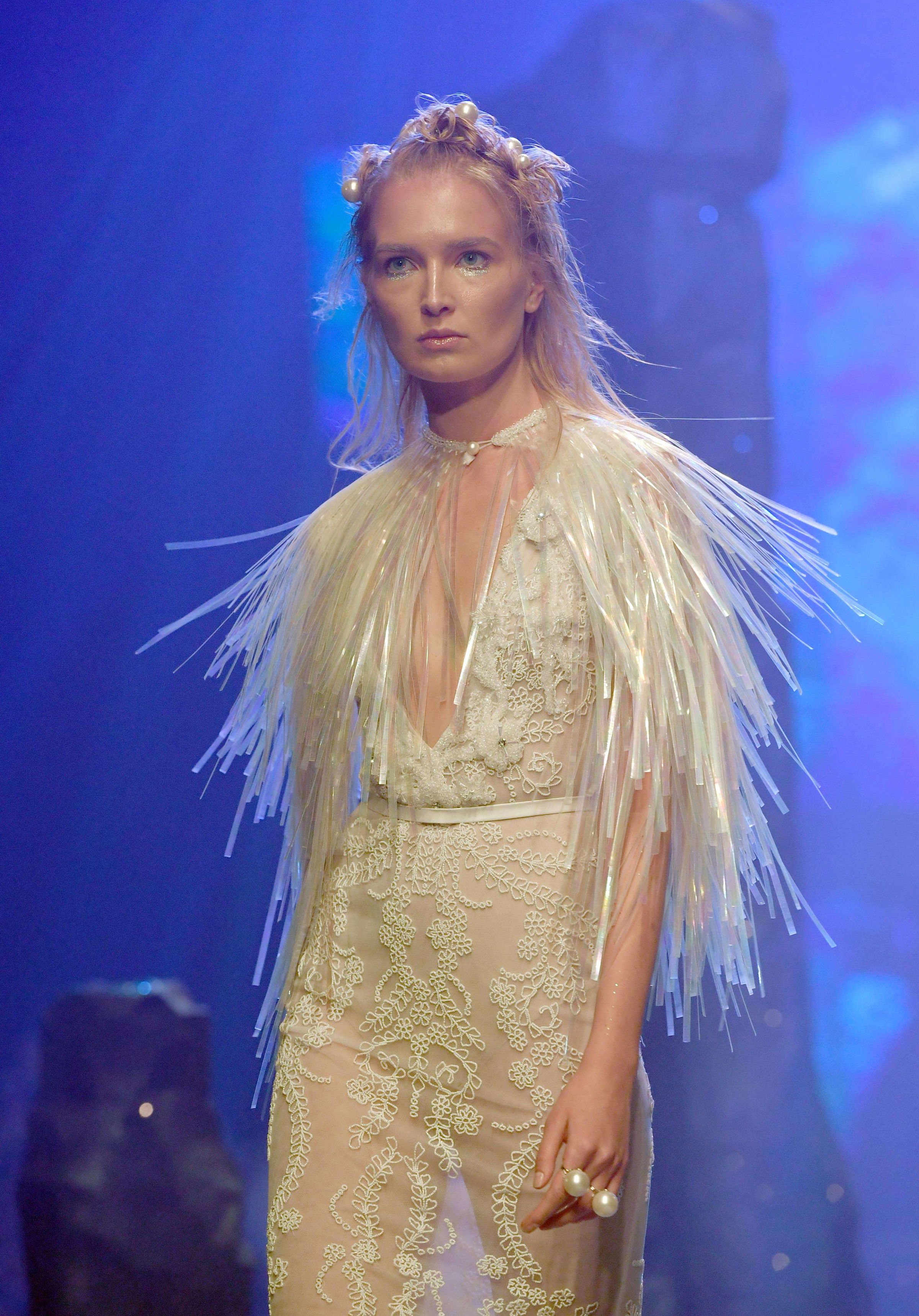 This season I wanted to show purity in the clothes. I decided to keep the styling to a minimal. The models were ethereal, light and clean. The dresses were also embroidered in delicate patterns, embellished with clear crystals and the colors were on the softer tones as well.