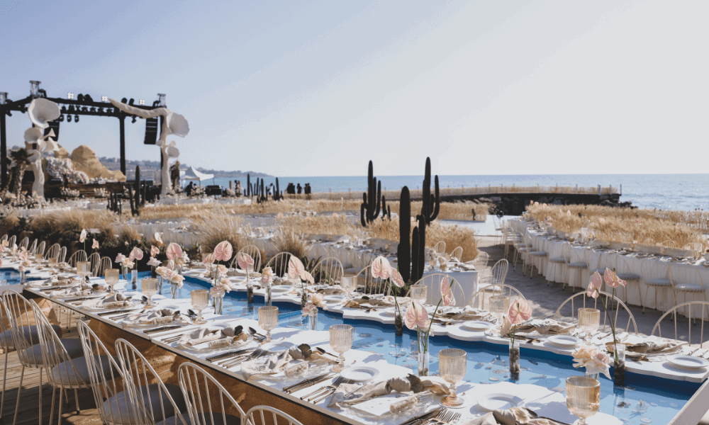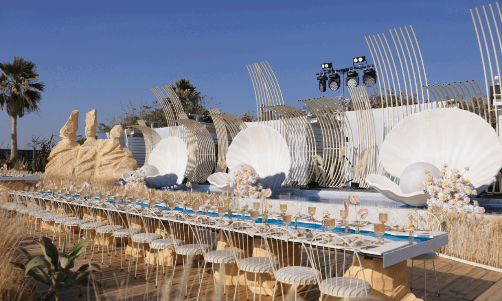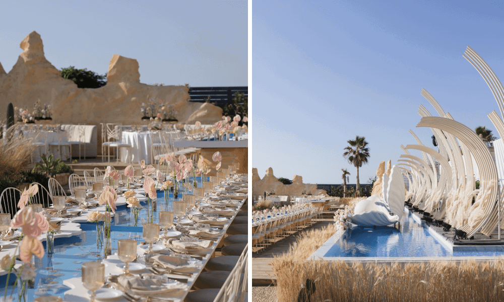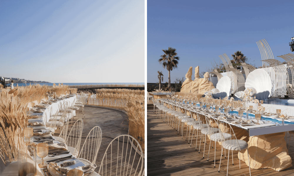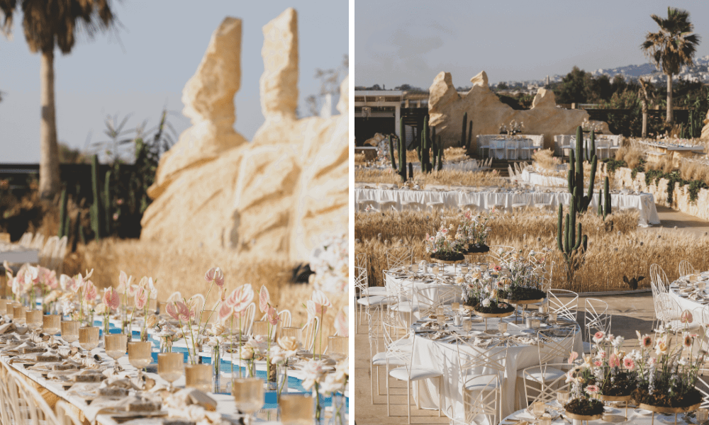Over 300 sqm of wheat, transported from the fertile Bekaa Valley, was replanted to create a golden horizon that danced with the Mediterranean breeze. Cactuses stood resilient among rugged rocks, while soft sand and shimmering sea framed the scene like a painter’s final stroke. Floating pearls in the pool caught the light — first from the sun, then from the stars — adding a touch of ethereal magic to the evening.