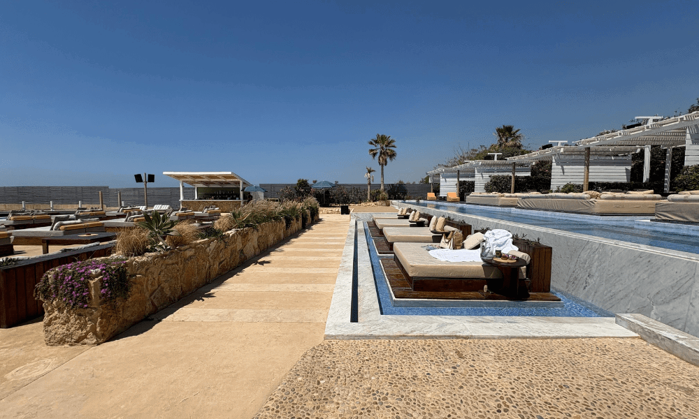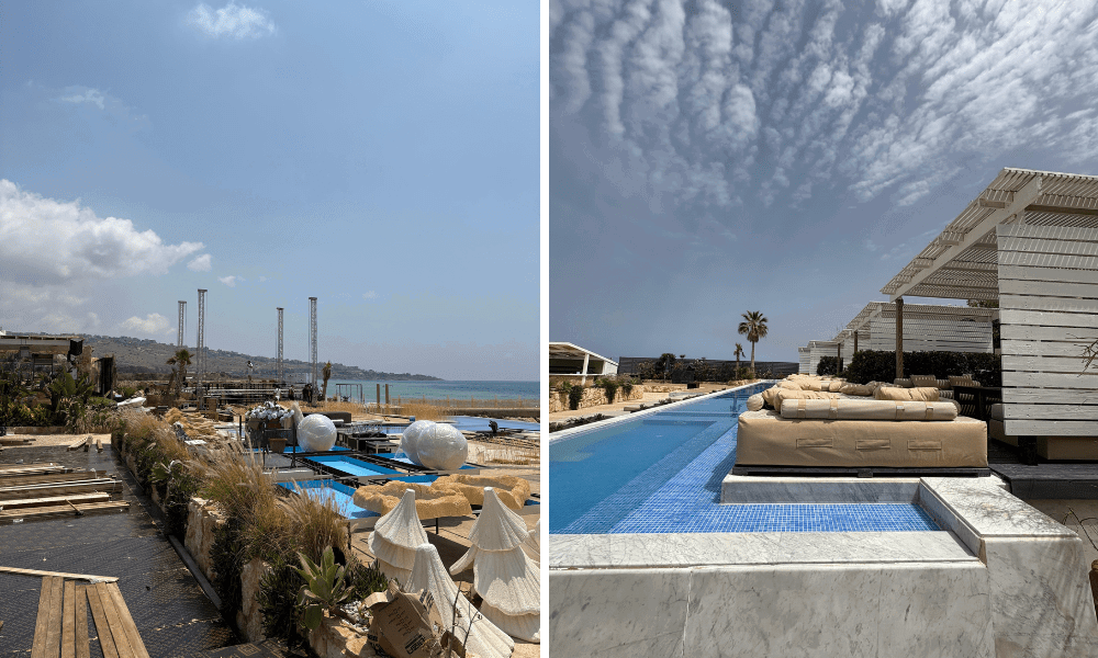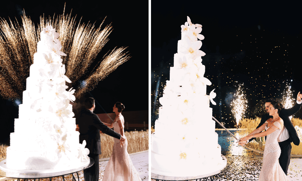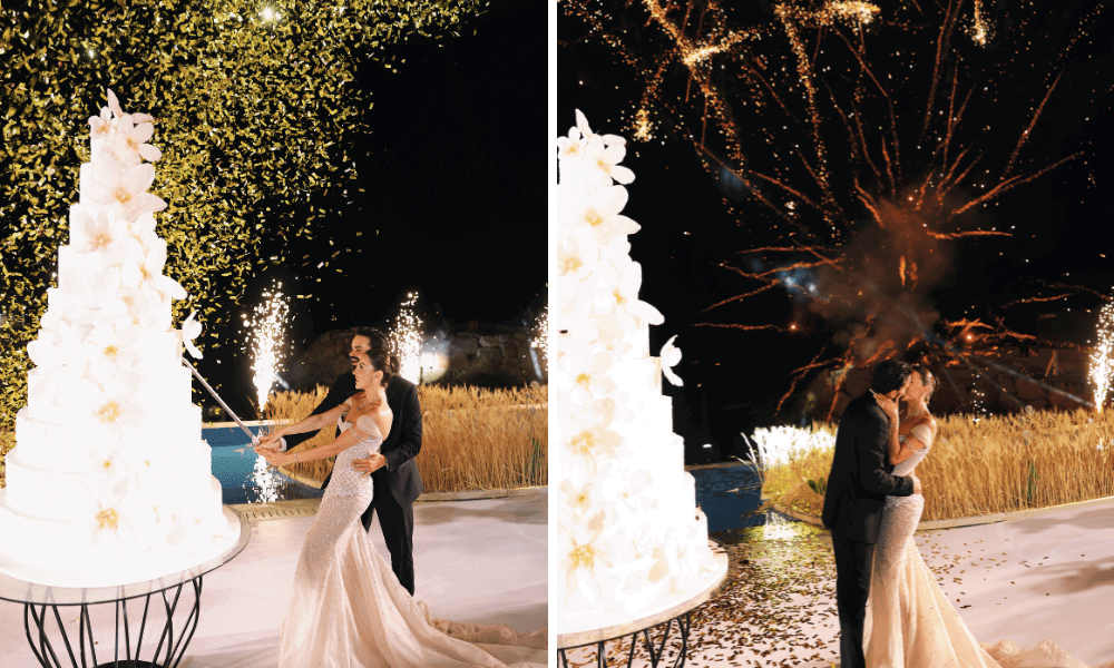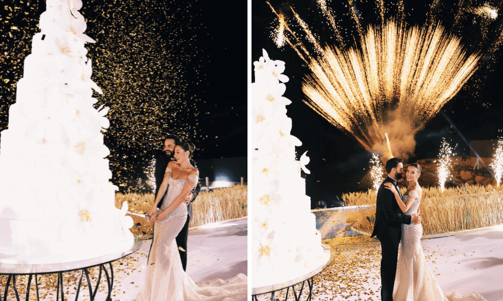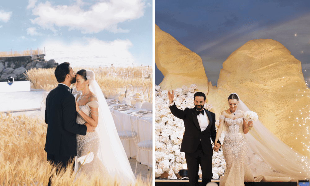 Over 300 sqm of wheat, transported from the fertile Bekaa Valley, was replanted to create a golden horizon that danced with the Mediterranean breeze. Cactuses stood resilient among rugged rocks, while soft sand and shimmering sea framed the scene like a painter’s final stroke. Floating pearls in the pool caught the light — first from the sun, then from the stars — adding a touch of ethereal magic to the evening.
