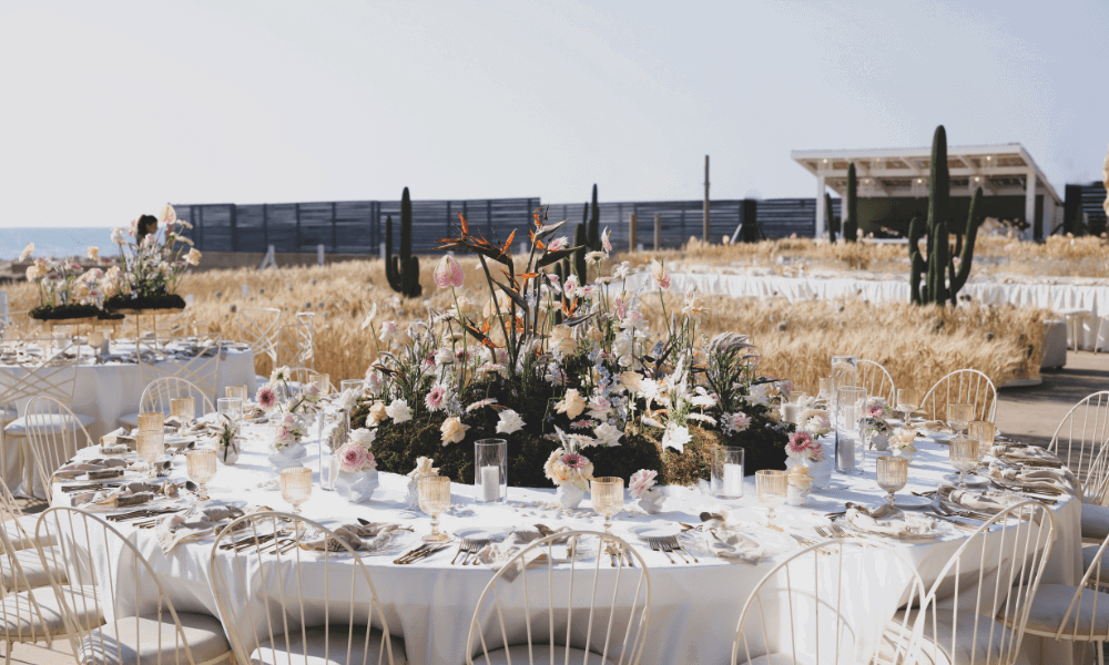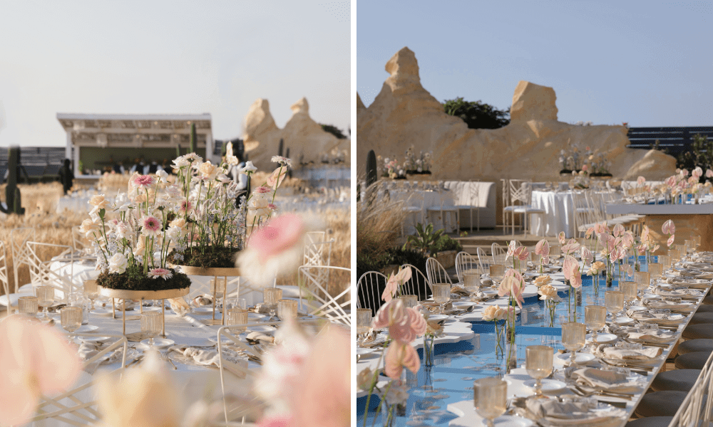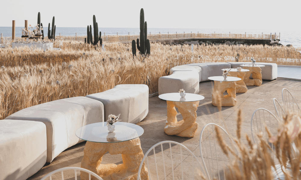 For two months, the Mémoire d’Art team sculpted the vision with precision and passion, followed by two days of immersive execution that turned the familiar coastline into a surreal canvas. Inspired by the quiet majesty of wheat fields, the stoic grace of desert landscapes, and the infinite embrace of the sea, the venue became a harmonious blend of contrasts.