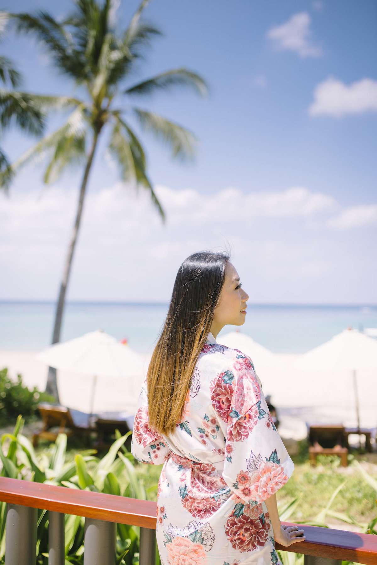 The new couple was blessed by the weather gods who seemed to have favored the wedding with the softest blues in sky and sea. The bride herself created a beautiful stationery set, fully hand-drawn in watercolour technique with elegant calligraphy. In tune with the design line, bridesmaids got ready wearing pretty flower-patterned robes, later changing into elegant pink dresses, while the groom, Bernard and his groomsmen looked smart in their dark-navy outfits