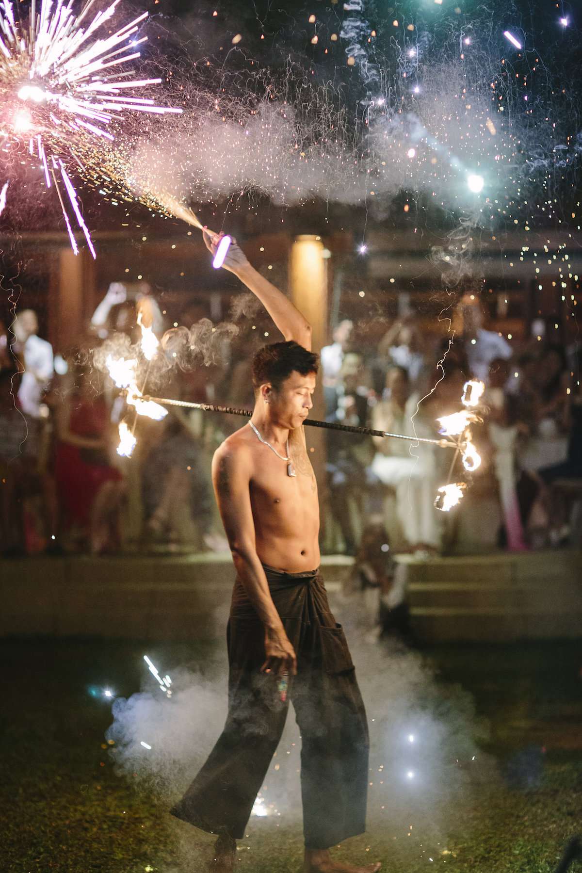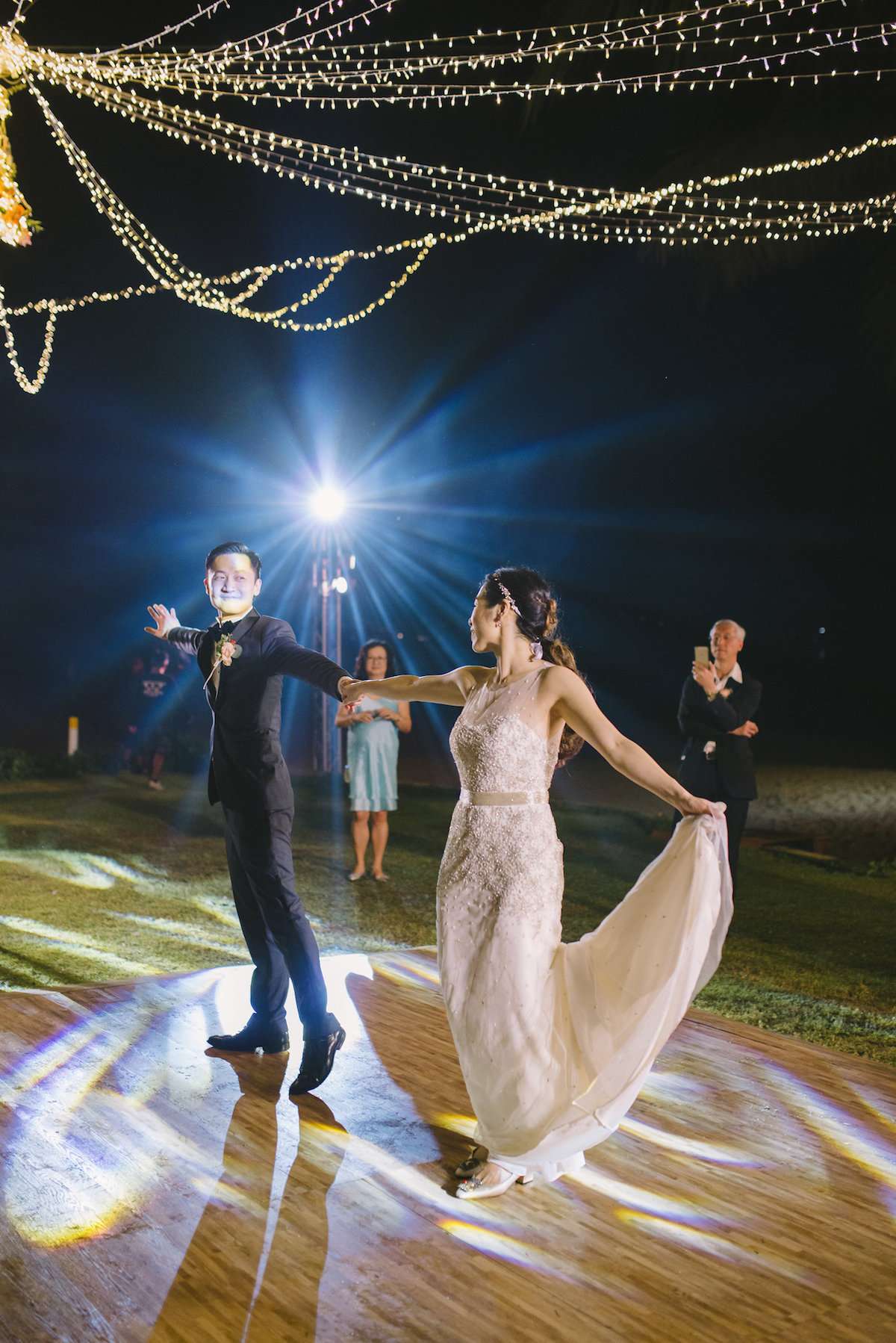 The weather forecast for the evening did not look quite promising, yet we were blessed with a nice weather and soft sunset, and darinimages captured some beautiful portraits for the couple and their bridal party at the beach after the ceremony. The night was full of lights, from magical fairy lights above the dancefloor, to dazzling performances of fire dancers and epic fireworks.