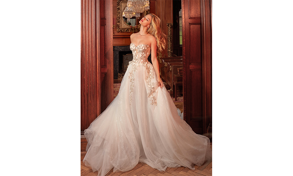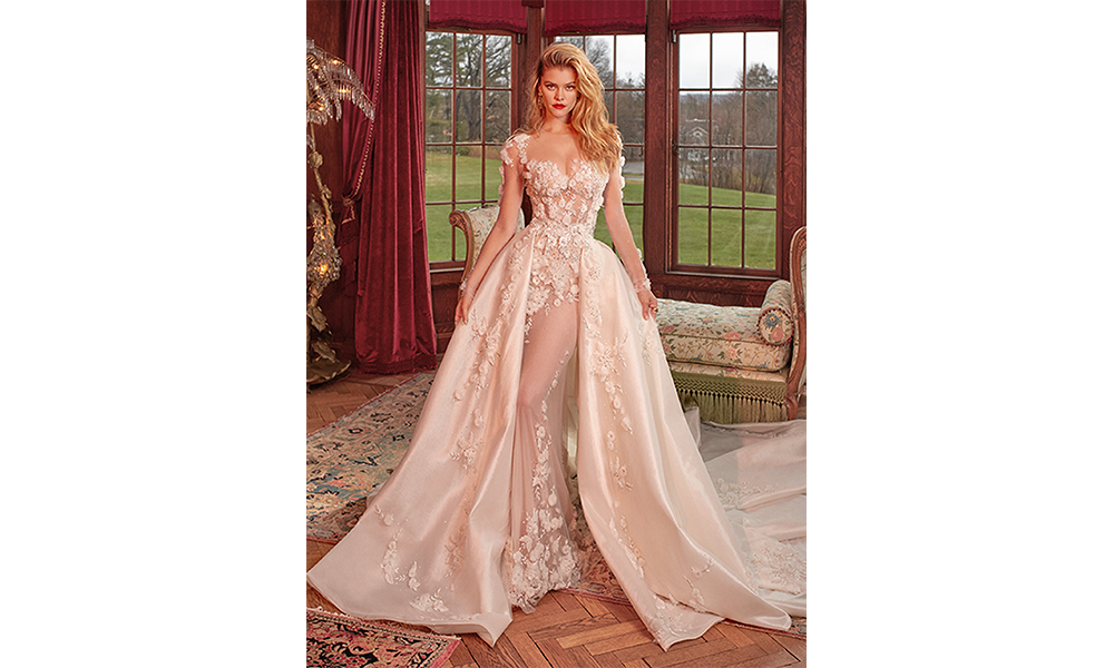 Galia Lahav is a fashion designer and businesswoman of Israeli descent. Lahav’s ‘Queen of Hearts’ collection is a testimony to ethereal fairy tale like, inspired love stories. Whereas, the imperial ‘Aelin’ ballgown is adorned with sequinned flower petals cascading down its tulle pleated skirt and a sheer corset top, ‘Thea’ is a bold statement piece. The chic bohemian, floral motif embroidered half ballgown, half mermaid silhouette is draped in Swarovski crystals and sequins.