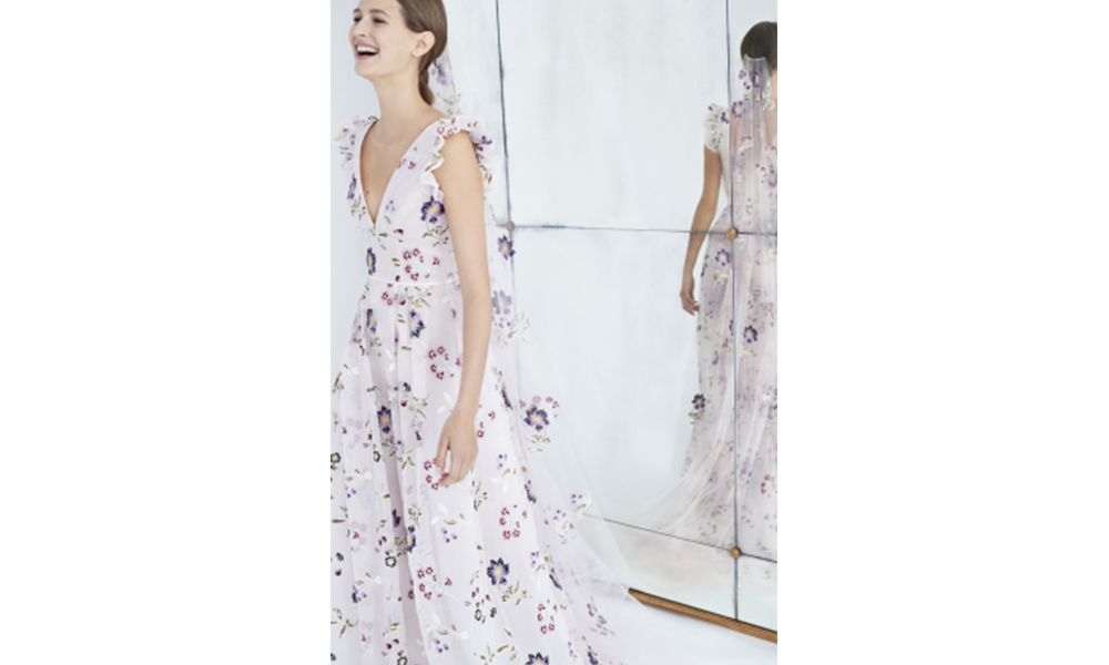 Carolina Herrera is a Venezuelan fashion designer known for her remarkable, eclectic personal style. She has dressed several famous public figures. World renowned celebrities such as ; Kate Middleton (the royal heiress), Nicole Kidman (actress), Karlie Kloss (model) along with various First Ladies, including Jacqueline Onassis, Laura Bush, and Michelle Obama have been styled by the exceptional Herrera. The one of a kind, ‘Gilda Gown’ from her fall 2018 collection is a pastel lavender wedding dress with hints of light fuchsia. It has a classic V-neckline with quirky ruffled sleeves, beautifully complemented with floral appliqués and a matching veil that evokes a garden fantasy!