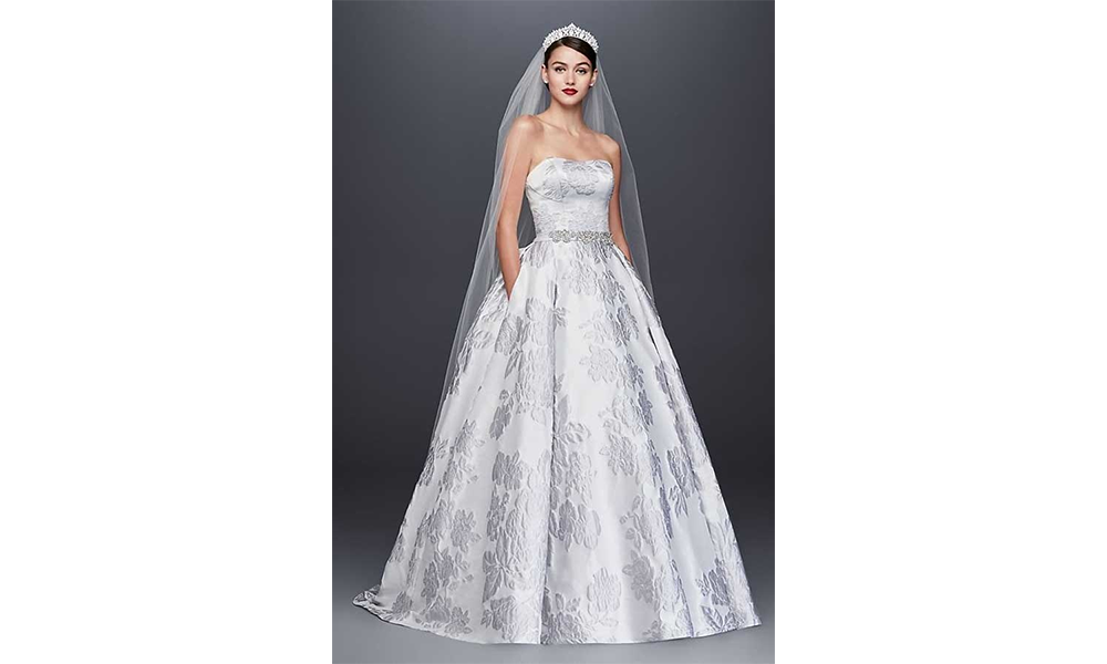 Oleg Cassini is an American designer originally hailing from Russia with a long-span history of Italian ancestry. Available at David’s Bridal, the ‘Floral Brocade Ball Gown’ is a stunning statement ball gown that epitomises a timeless silhouette gilded with regal floral brocade motifs. Accompanied by a beaded grosgrain sash topped with butterfly patterns crafted of 3,000 beads adds a whimsical touch.