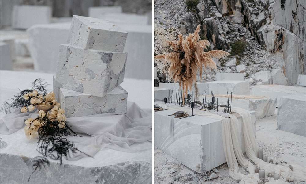 The monochromatic tones from this setup are everything you need to make your wedding a true masterpiece. The use of muted colors along with pampas grass tabletop alongside the rich black table plates set on a marbled cut is ethereal and we are sure every art enthusiast will adore it!