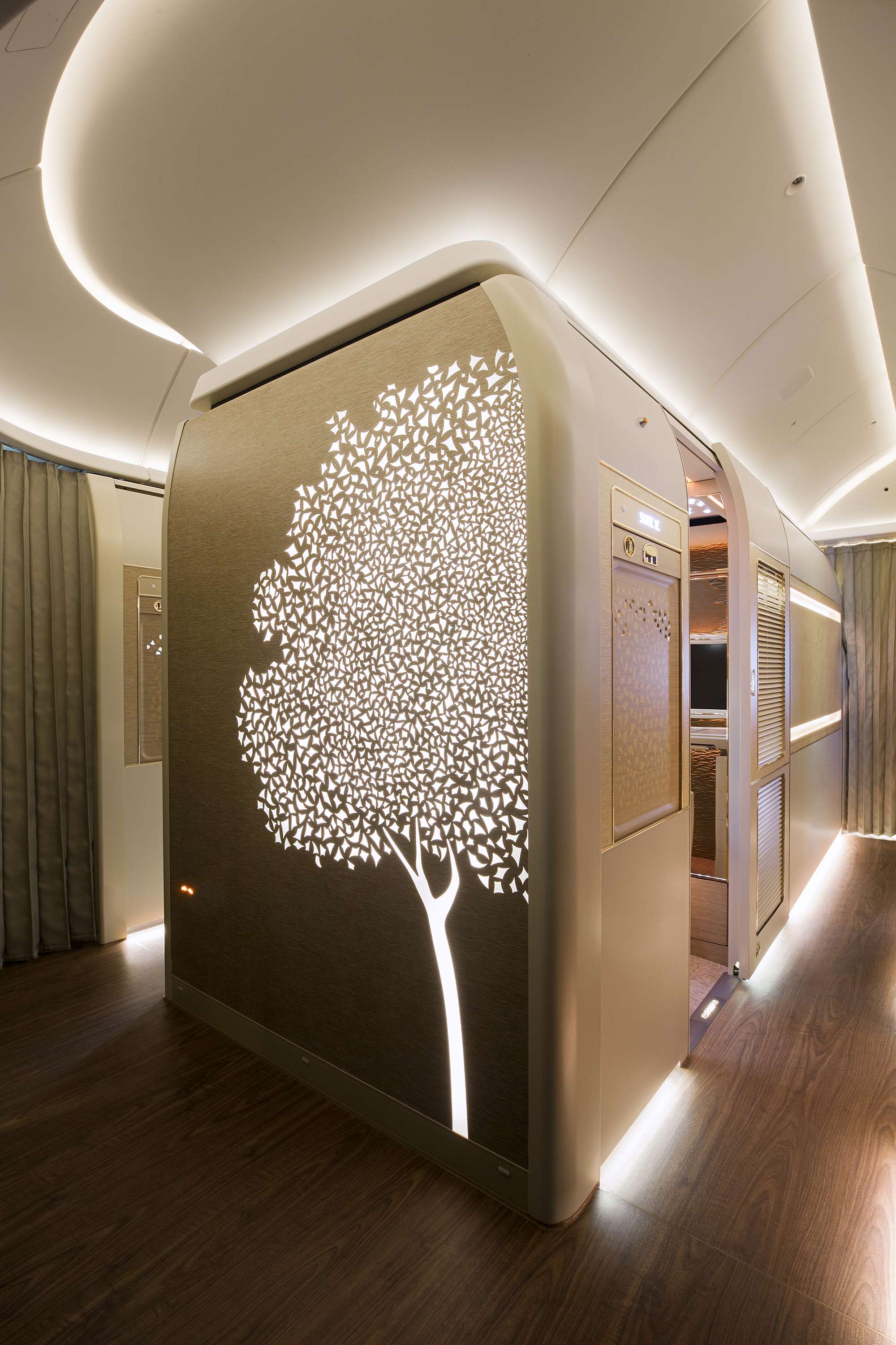 The cabin interiors feature tonal hues of soft greys, cream and champagne, conveying a contemporary, open and airy feel, with quiet and timeless luxury. Created in collaboration with Boeing, Rockwell Collins interior systems, Panasonic, Jacques Pierre Jean Design studio and Seattle-based design firm Teague, each fully enclosed private suite has a combines smart technologies such as virtual windows project the view from outside the aircraft using real time camera technology, room service using the video call devices and on-demand entertainment on a 32-inch Full HD LCD TV screen enhanced with Bowers & Wilkins Active Noise Cancelling E1 headphones created exclusively for Emirates.