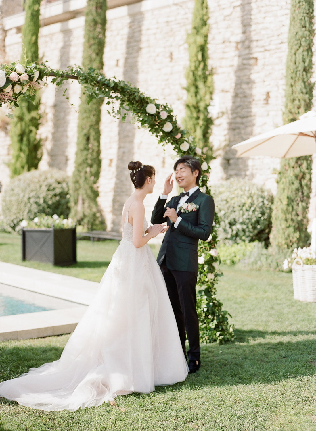 With families from Hong Kong, France and London, and friends from all over, L&K’s wedding was a very international one. The intimate setting of the venue was perfect to keep everyone together and make sure that all groups had the opportunity to mix, while enjoying the amazing views over the landscapes of Provence. The bride wore a fabulous Monique Lhuillier dress for the ceremony and reception, then changed into a more fluid Camille Marguet dress for the dancing party. The groom chose Dolce&Gabbana for his attire, from suit to shoes.