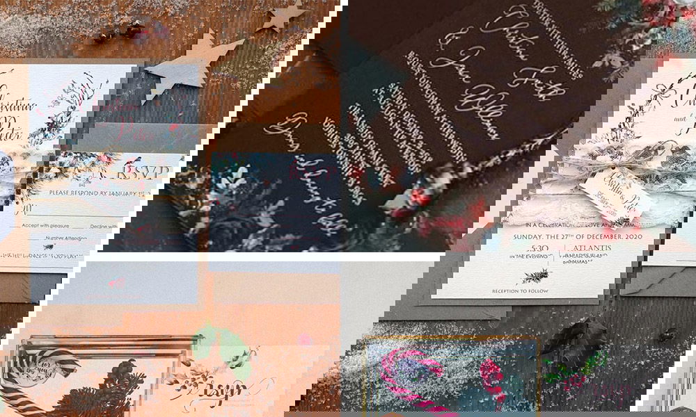 Be inspired by the cheerful occasion and make your invitations unique and unforgettable for your guests by including hues of reds and green coupled with images of beautiful floral wreaths. Wreaths are festive decorations hung during Christmas time, which symbolise eternity, whilst the evergreen that is frequently utlised in the making of wreaths represents growth and everlasting. Is there a better way to begin your marital life?!