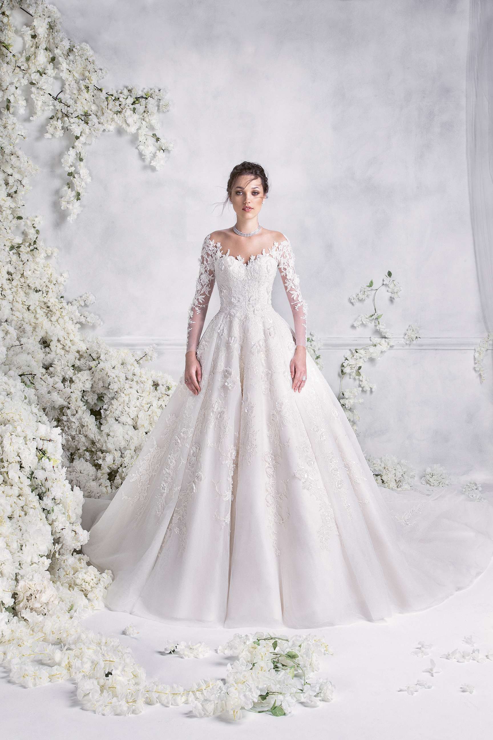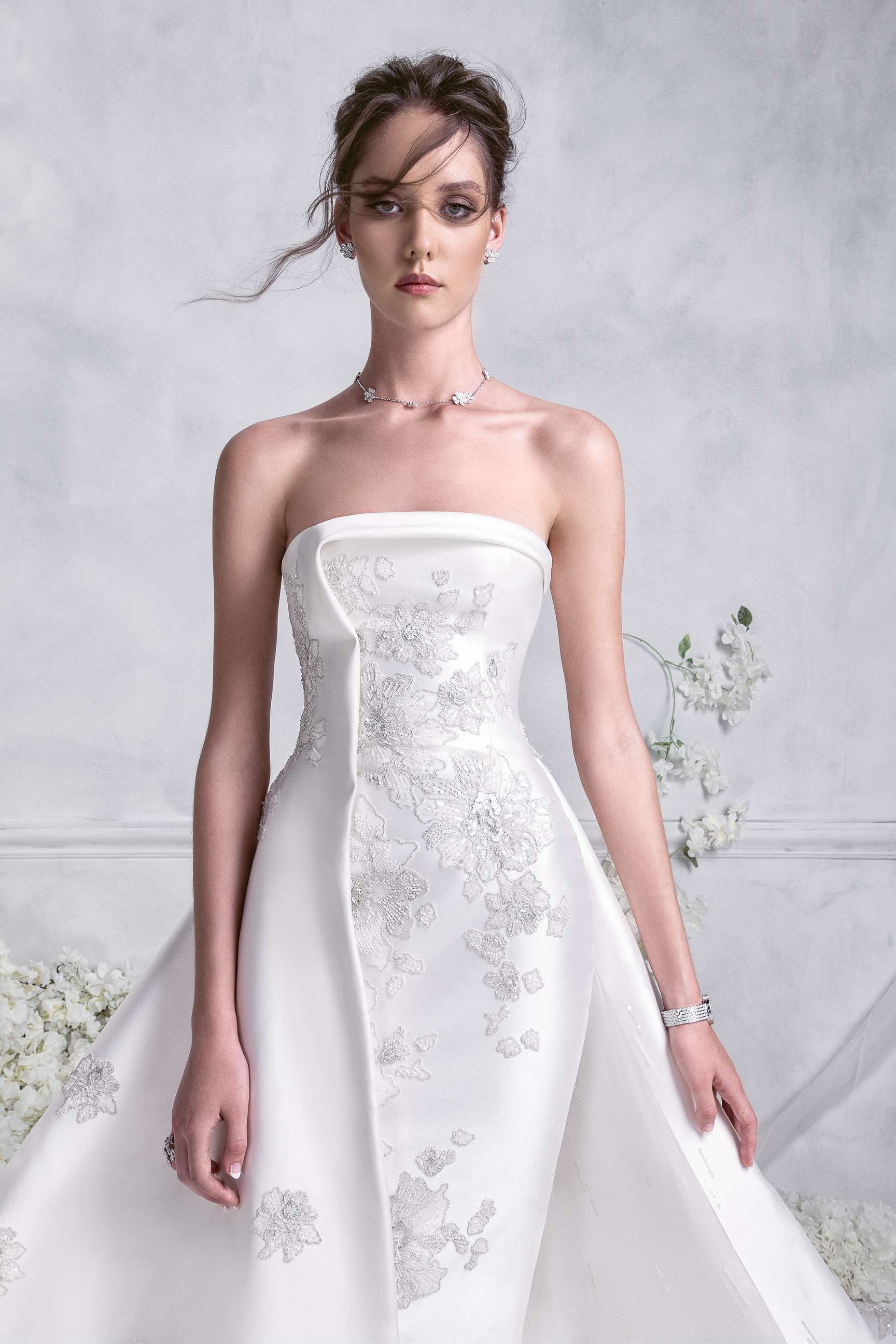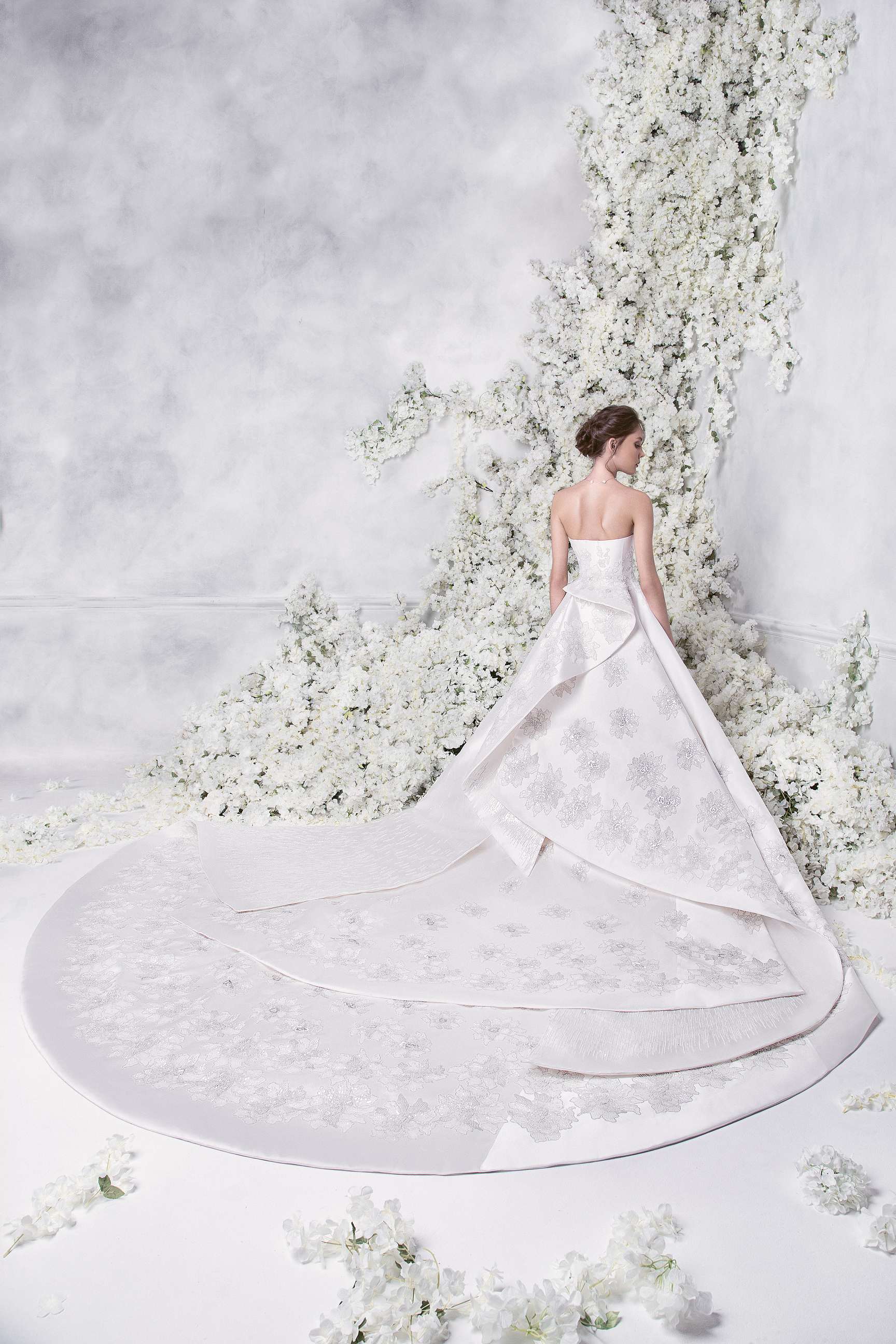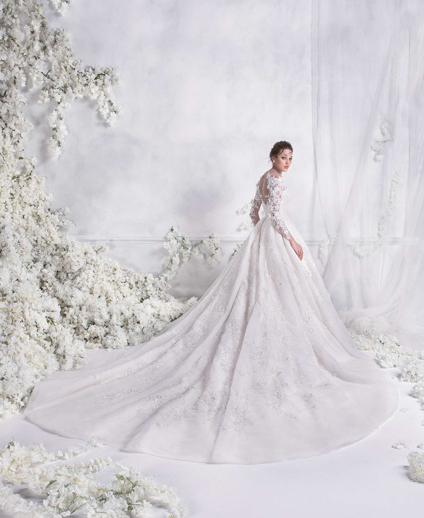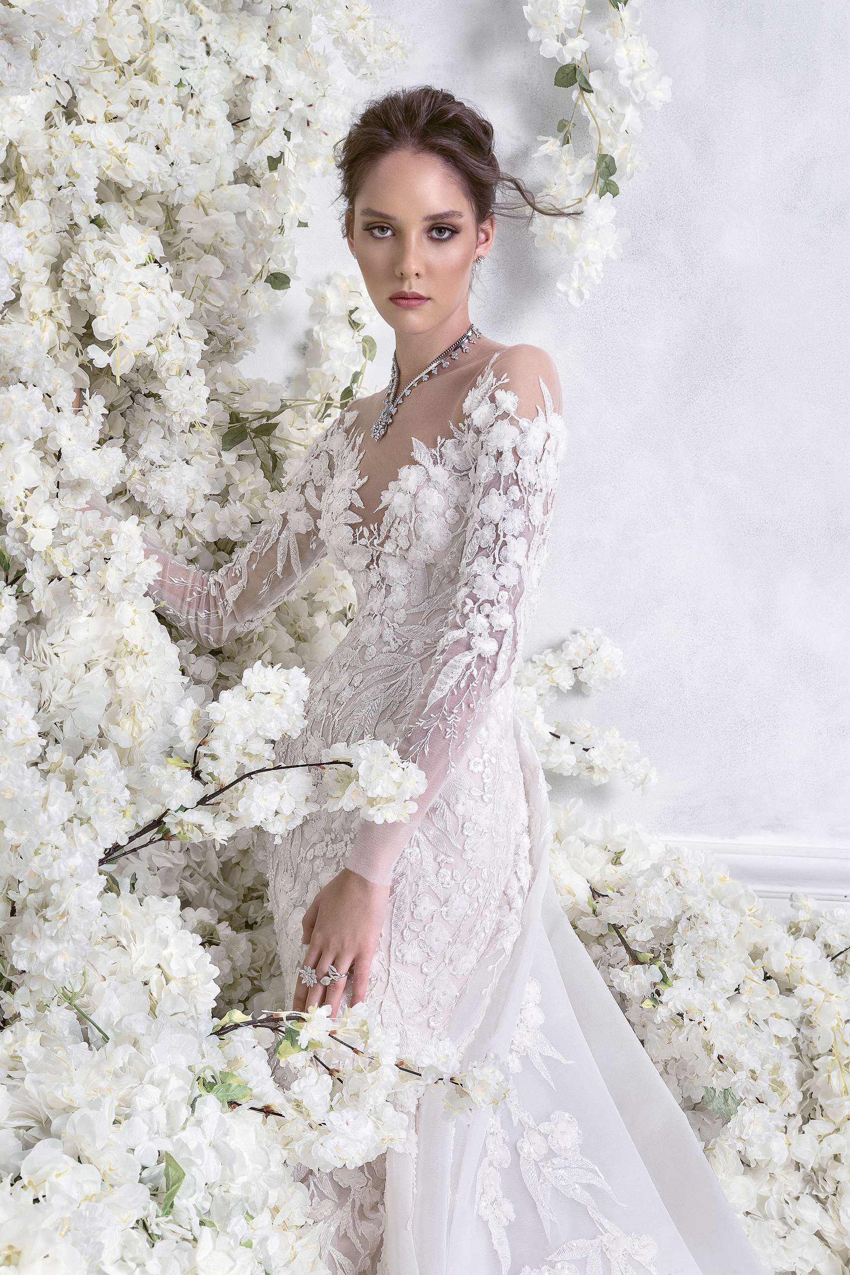 The romantic silhouettes crafted in striking shades of white, are further enhanced through rich embroidery and whimsical fabrics. The use of tulle and silk satin gives the pieces mesmerizing movement, whilst lace and embroidered lace beautifully adorn sleeves and necklines for the most magical finish.