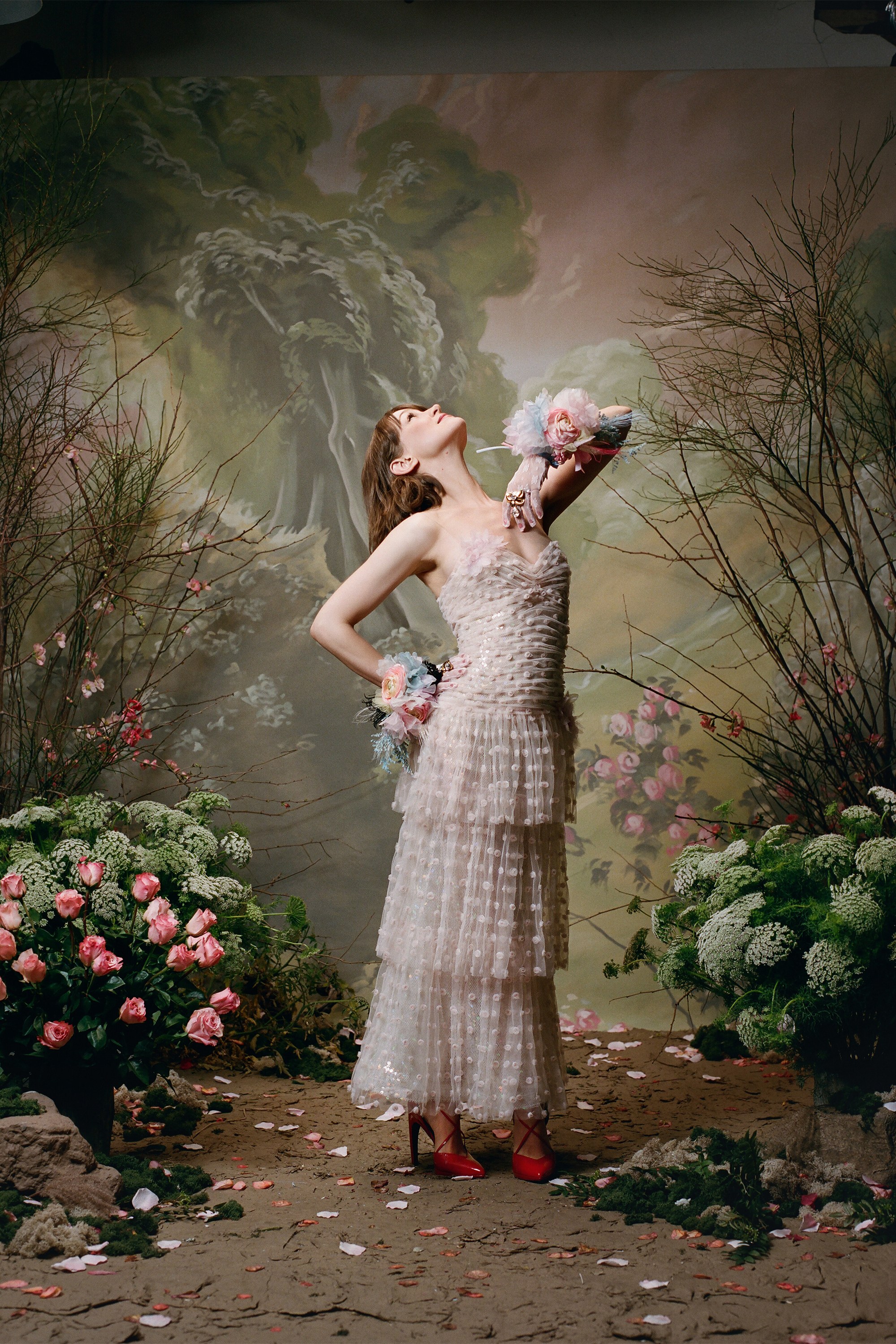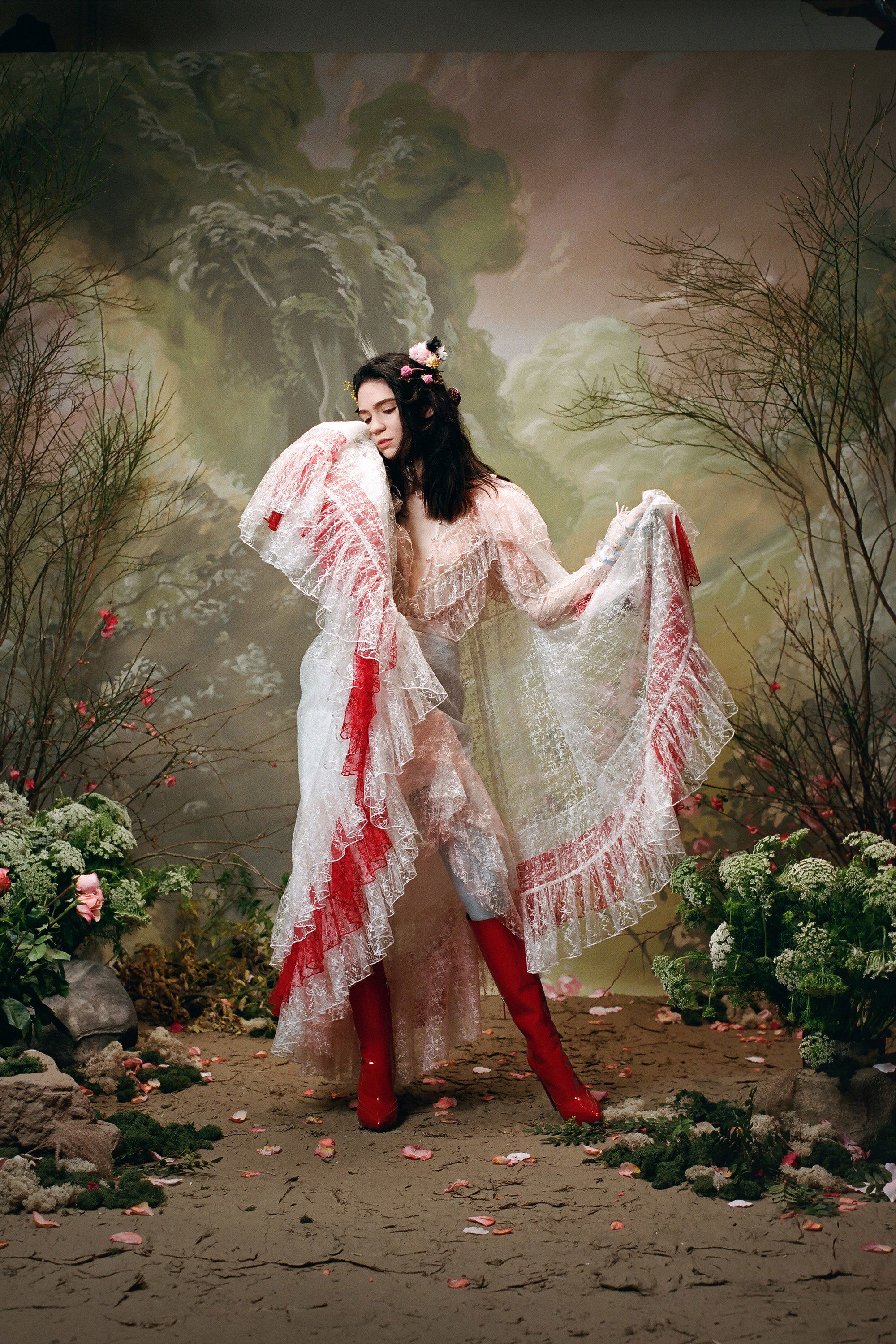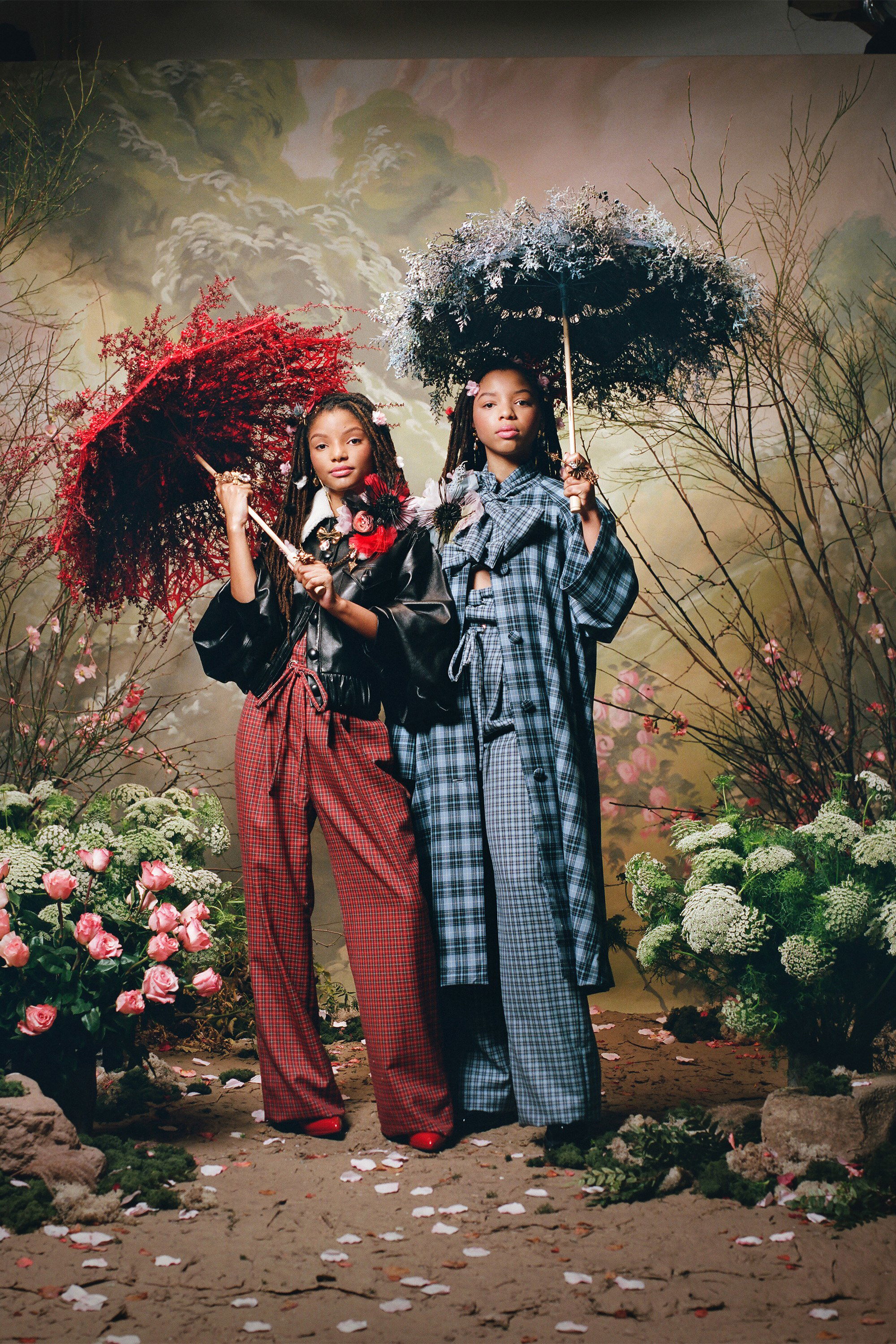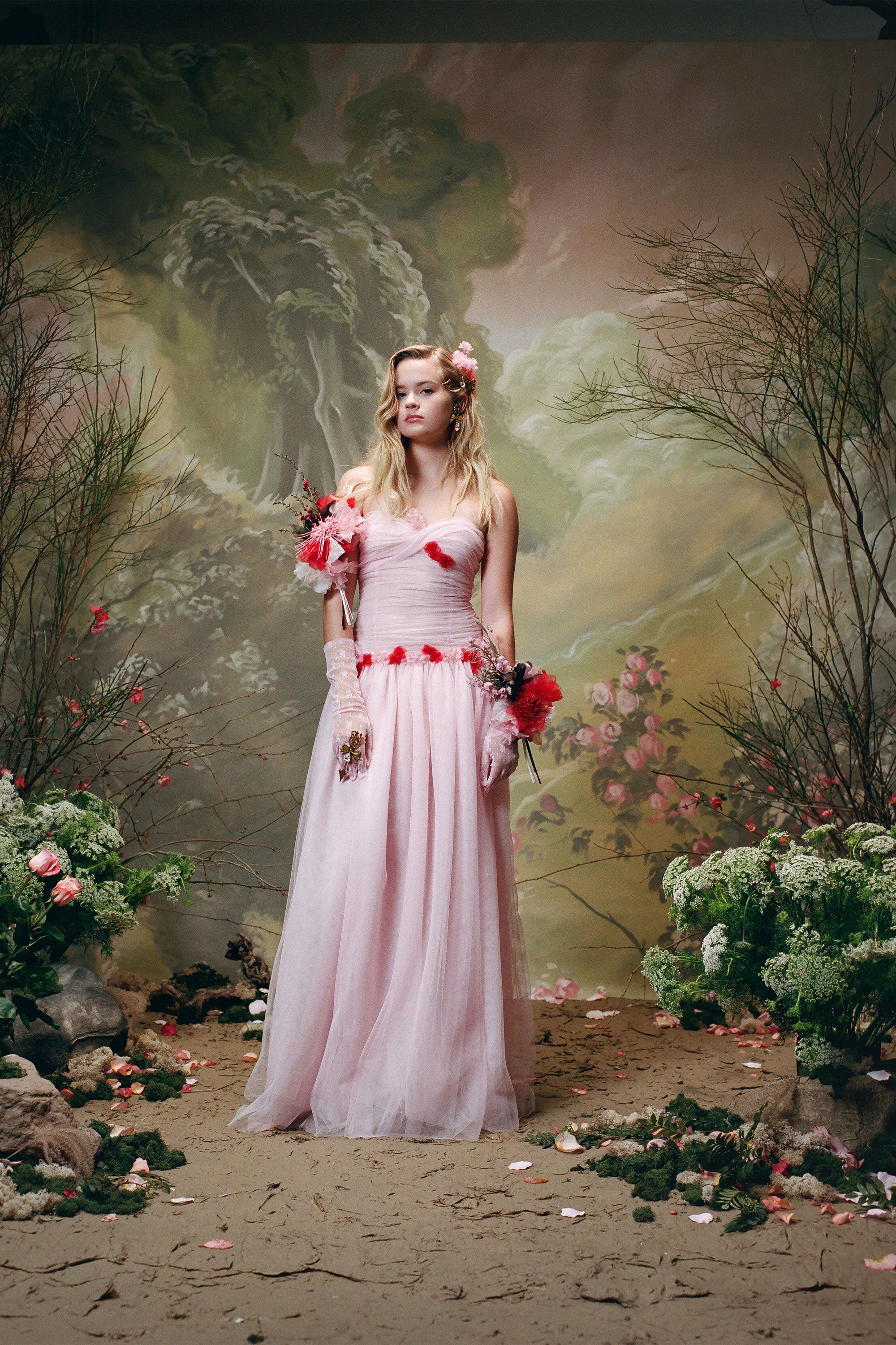 In ruffled lace blouses, flamenco frill skirts and an array of neutral sheer dresses with embroidered floral motifs, the brigade of Rodarte’s muses looked like dreamy Victorian maidens as they posed in front of a hand-painted rustic backdrop that instantly captures vintage Hollywood romance. The stunning photo album captured by Autumn de Wilde featured the brand’s unofficial faces such as Chloe and Halle of Grimes, Kim Gordon, Rowan Blanchard, (a very pregnant) Kirsten Dunst, and Reese Witherspoon’s daughter Ava Philippe amongst many others. What really brings the alluring shoot to life is the floral element of it, decorated with fresh parapluies flowers and twiggy branches, crafted in collaboration with the L.A.-based florist and a Rodarte kindred spirit, Joseph Free.