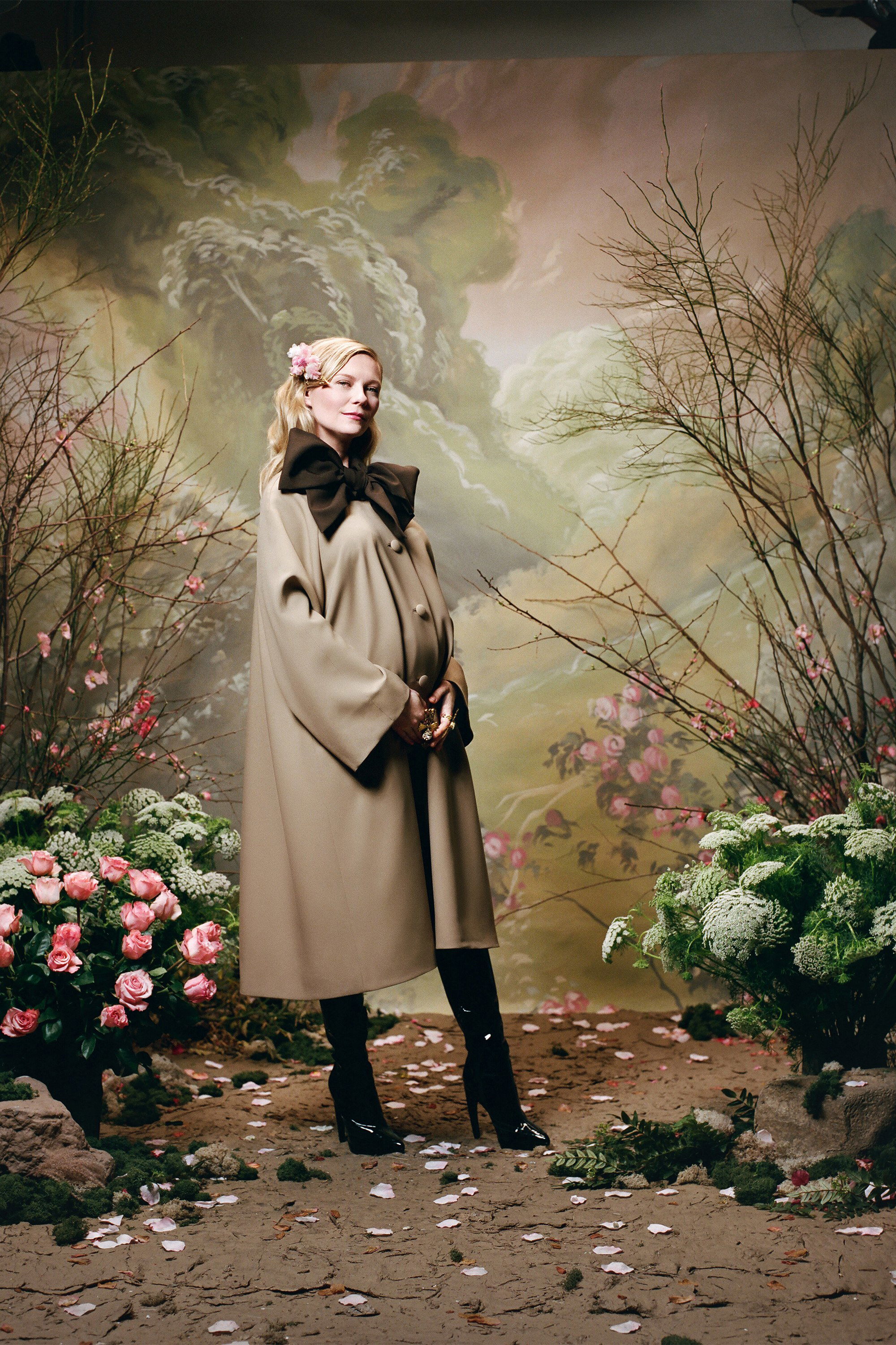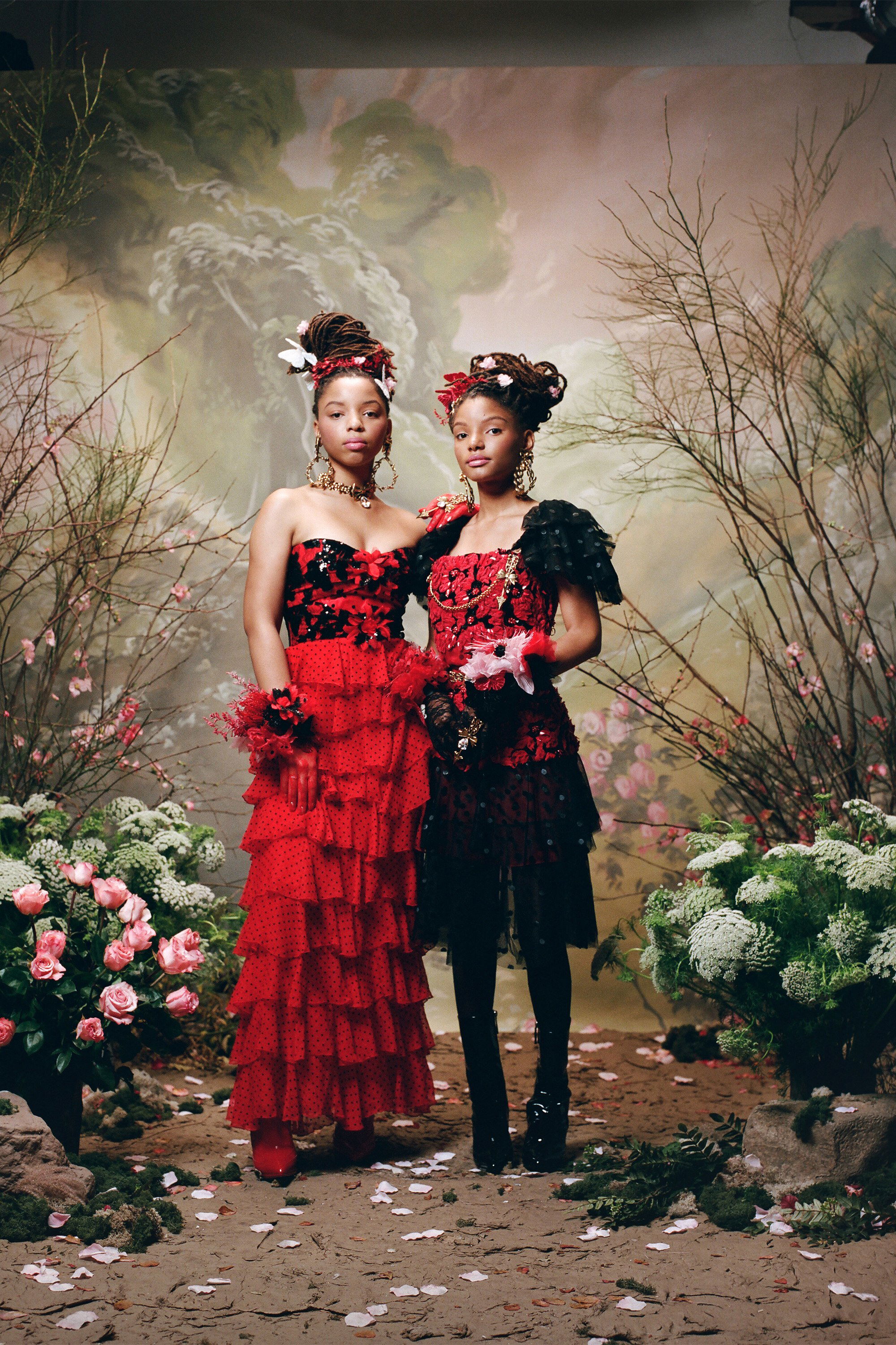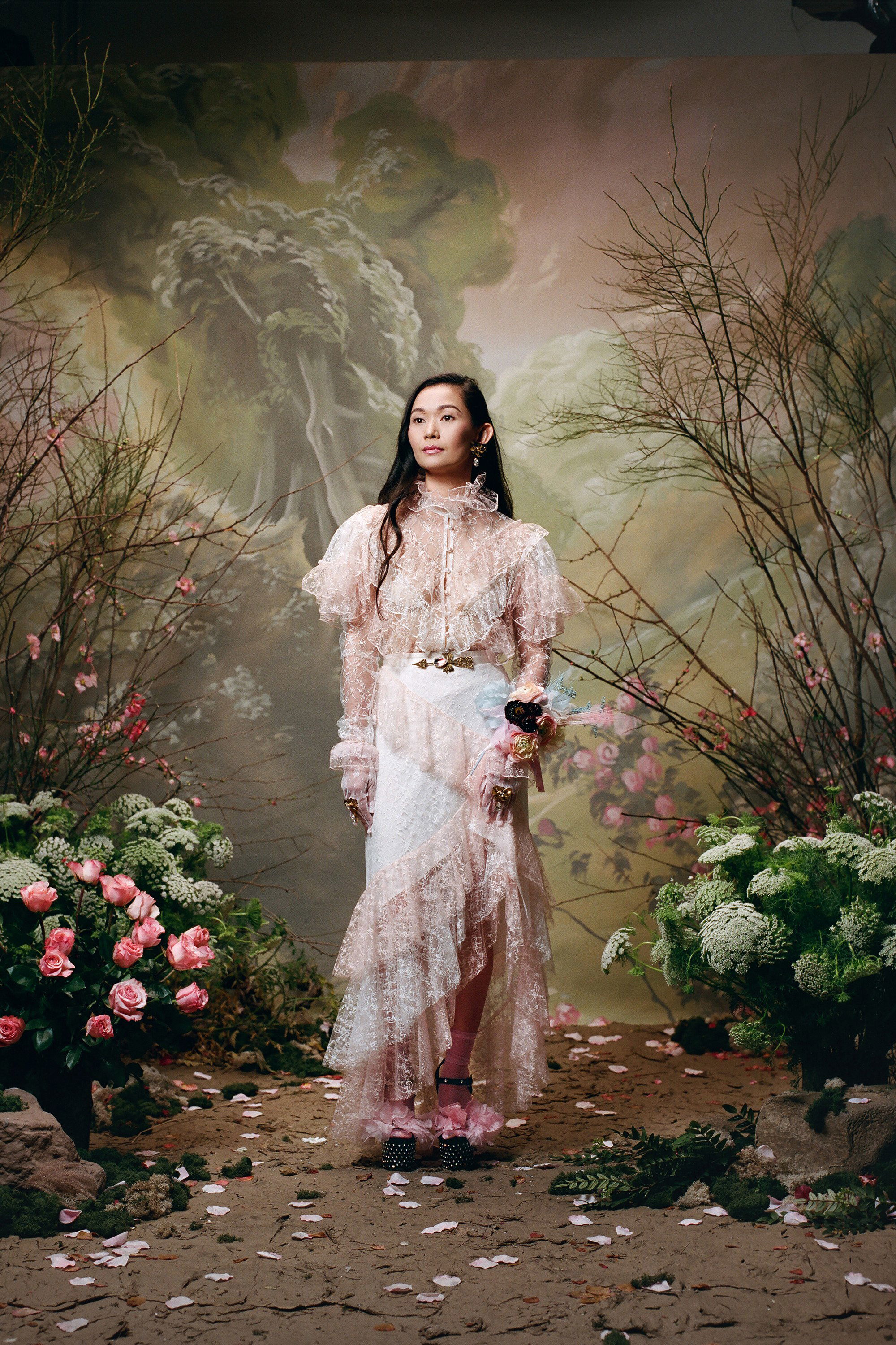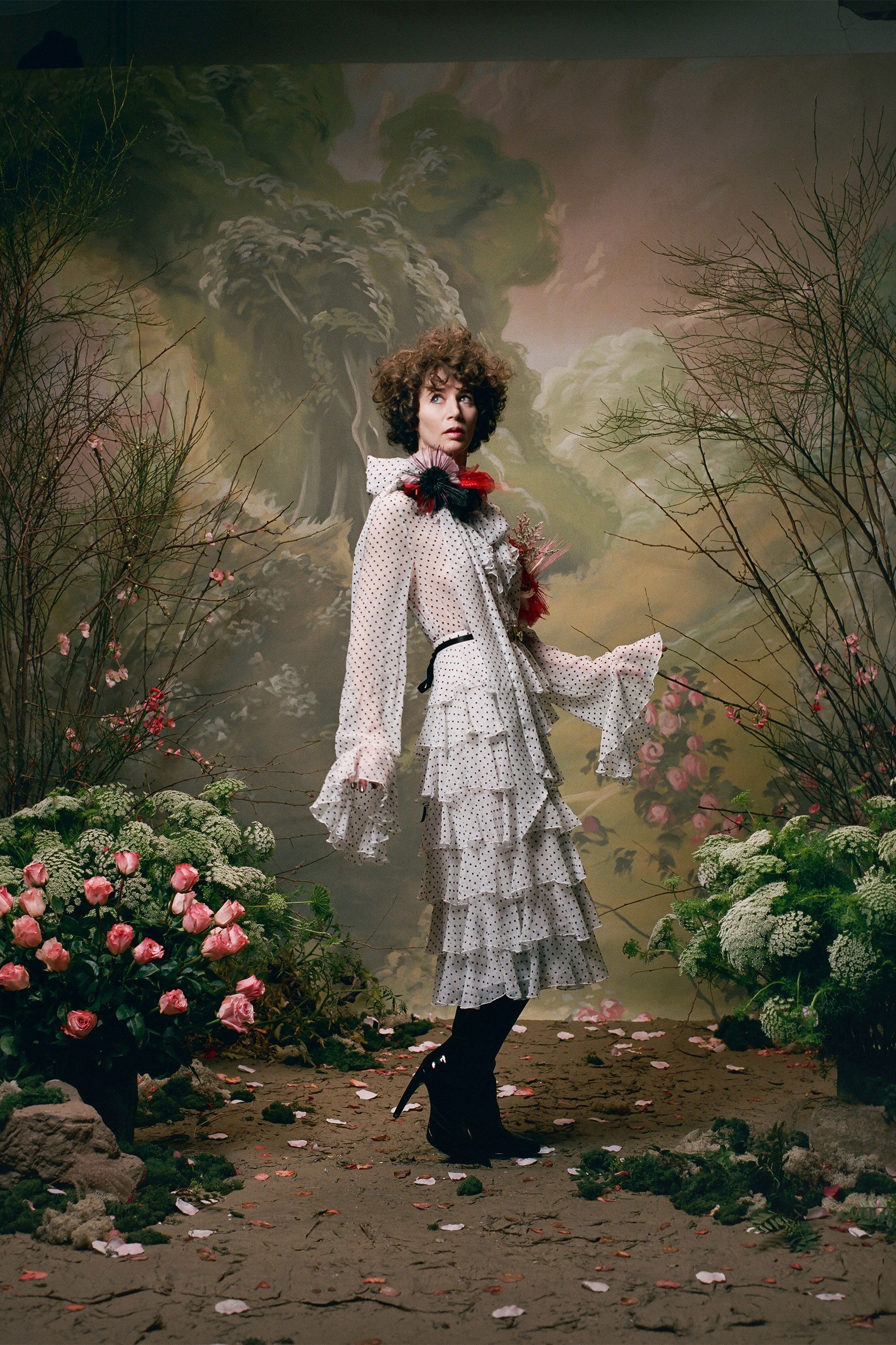 In ruffled lace blouses, flamenco frill skirts and an array of neutral sheer dresses with embroidered floral motifs, the brigade of Rodarte’s muses looked like dreamy Victorian maidens as they posed in front of a hand-painted rustic backdrop that instantly captures vintage Hollywood romance. The stunning photo album captured by Autumn de Wilde featured the brand’s unofficial faces such as Chloe and Halle of Grimes, Kim Gordon, Rowan Blanchard, (a very pregnant) Kirsten Dunst, and Reese Witherspoon’s daughter Ava Philippe amongst many others. What really brings the alluring shoot to life is the floral element of it, decorated with fresh parapluies flowers and twiggy branches, crafted in collaboration with the L.A.-based florist and a Rodarte kindred spirit, Joseph Free.