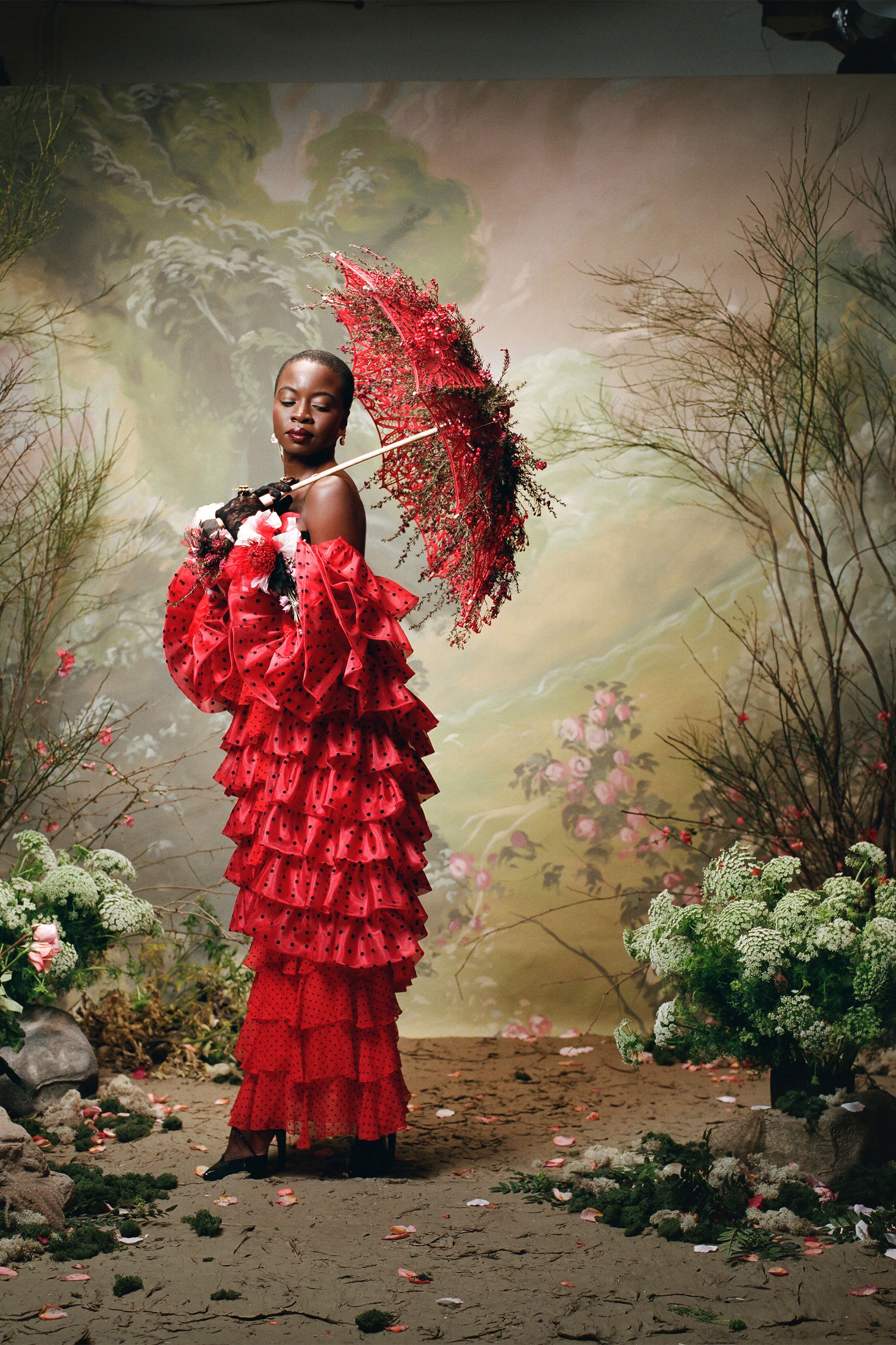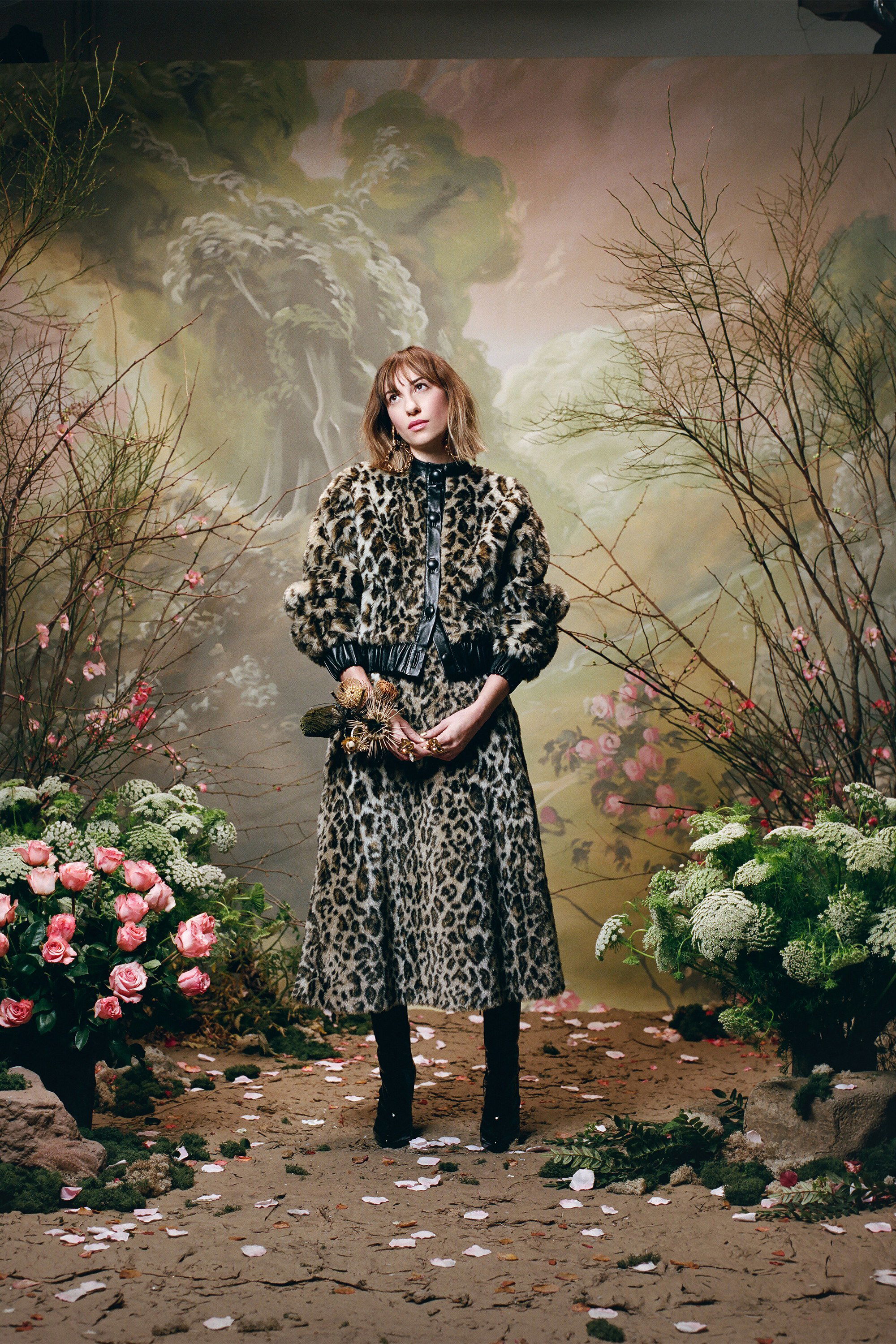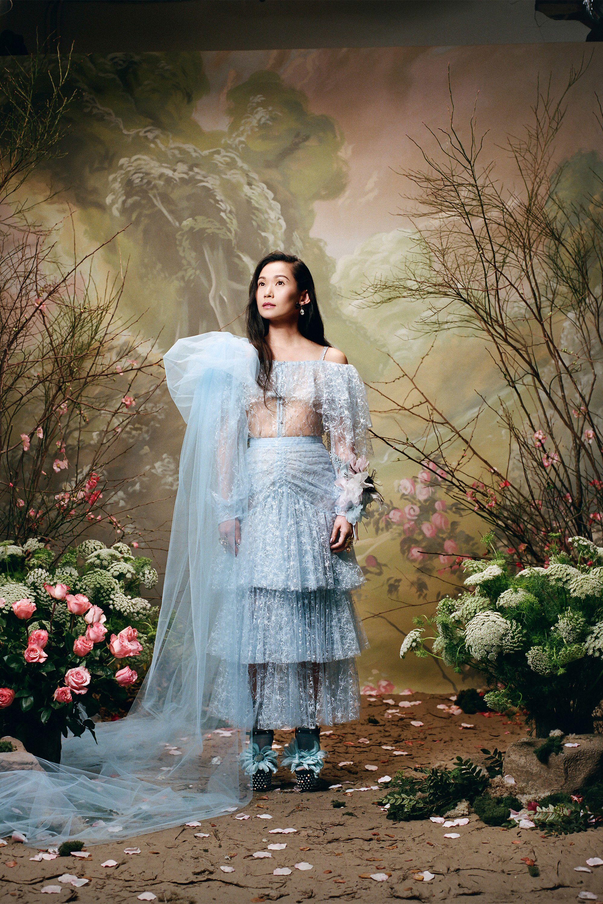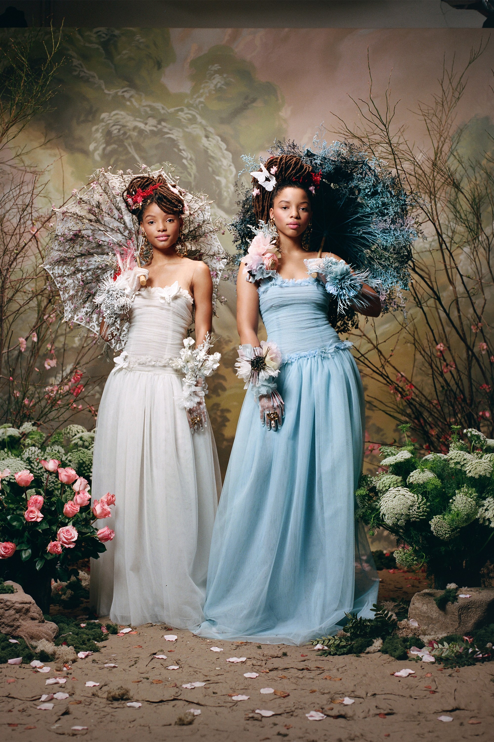 In ruffled lace blouses, flamenco frill skirts and an array of neutral sheer dresses with embroidered floral motifs, the brigade of Rodarte’s muses looked like dreamy Victorian maidens as they posed in front of a hand-painted rustic backdrop that instantly captures vintage Hollywood romance. The stunning photo album captured by Autumn de Wilde featured the brand’s unofficial faces such as Chloe and Halle of Grimes, Kim Gordon, Rowan Blanchard, (a very pregnant) Kirsten Dunst, and Reese Witherspoon’s daughter Ava Philippe amongst many others. What really brings the alluring shoot to life is the floral element of it, decorated with fresh parapluies flowers and twiggy branches, crafted in collaboration with the L.A.-based florist and a Rodarte kindred spirit, Joseph Free.