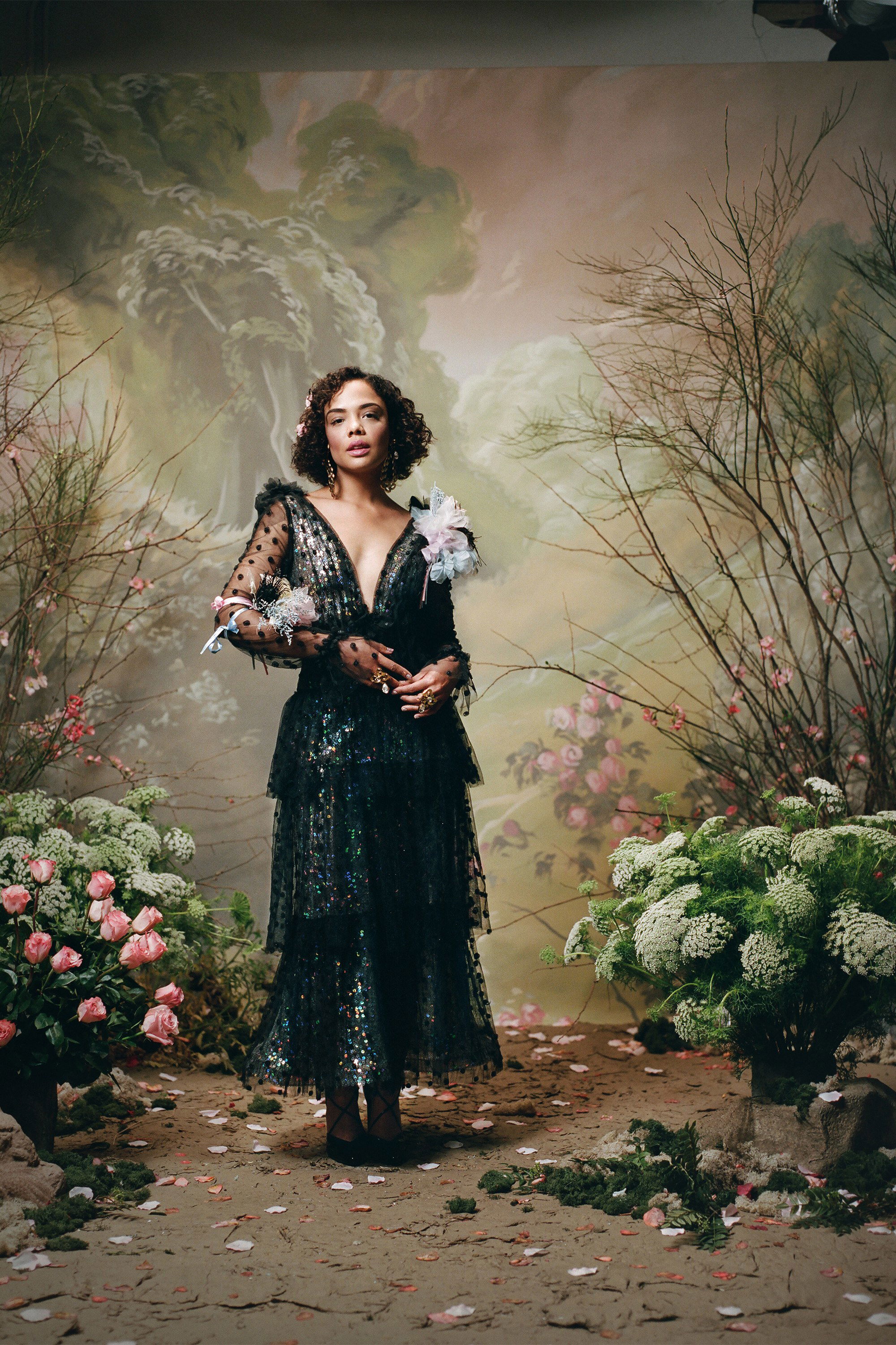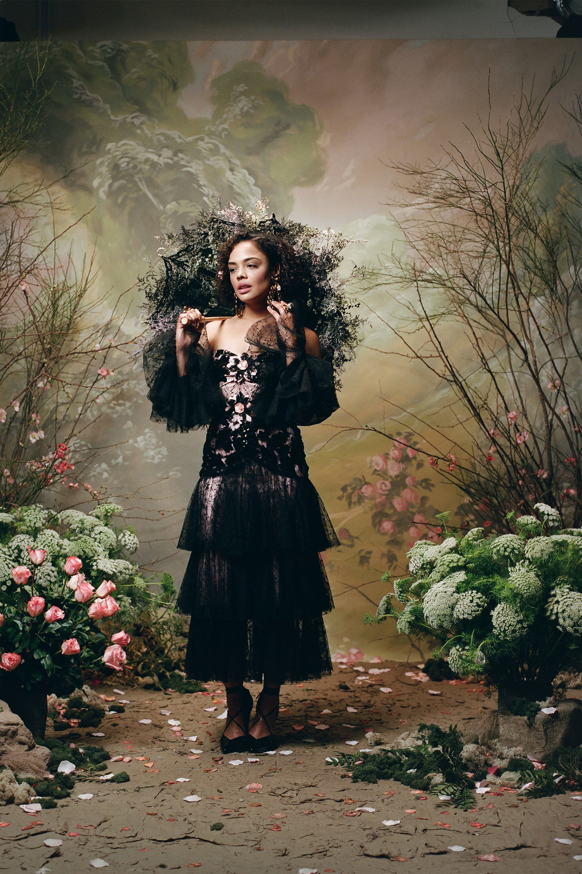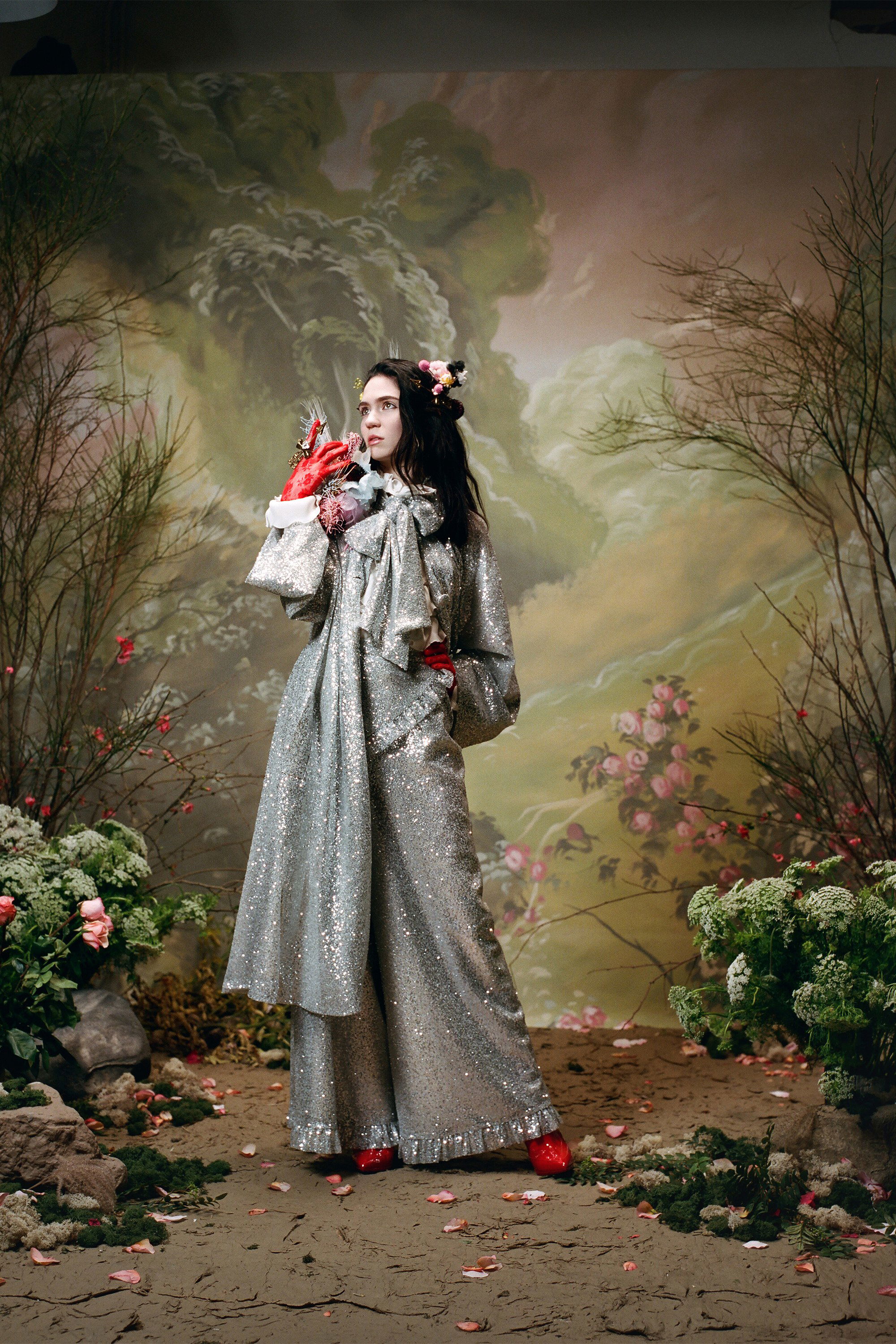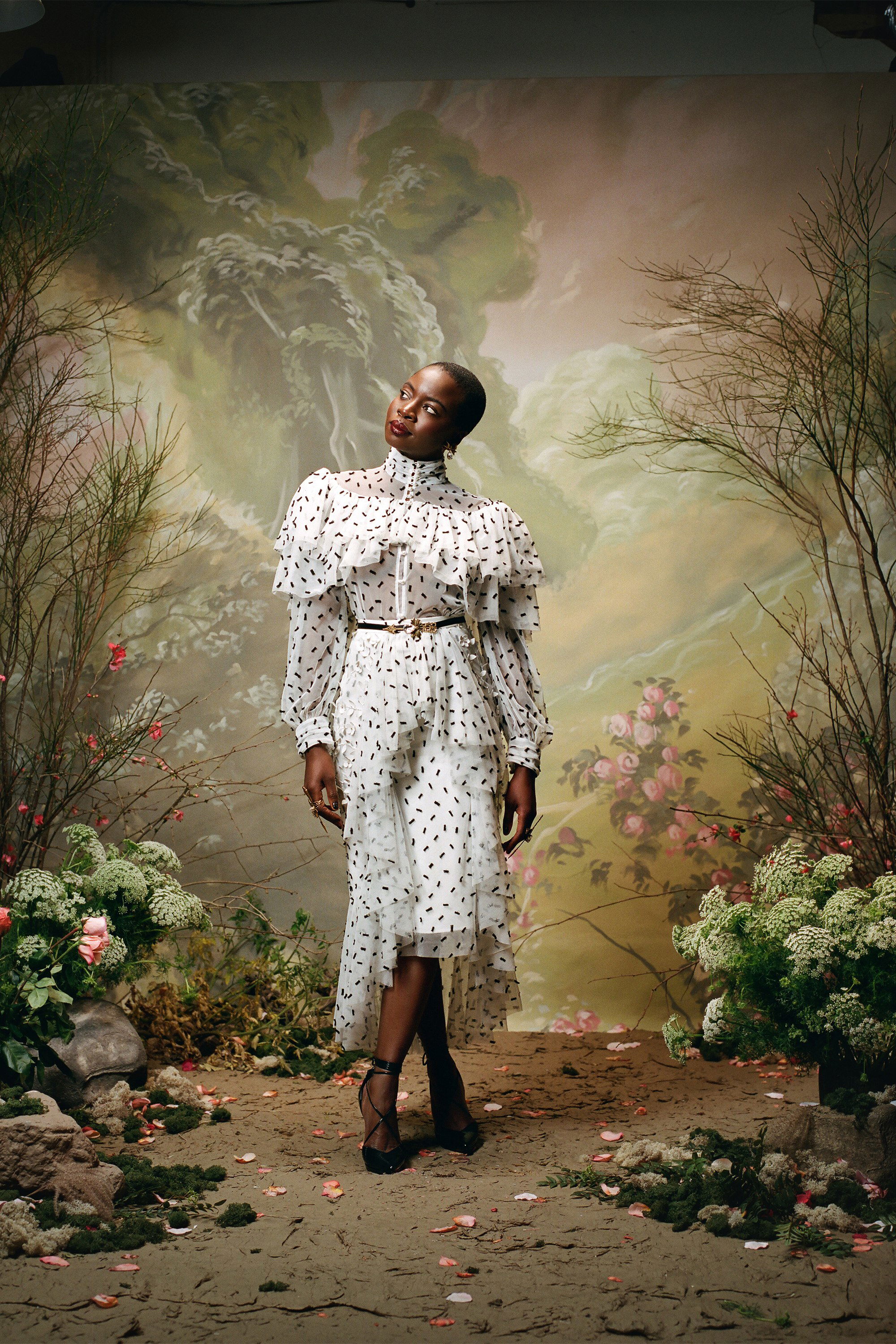 In ruffled lace blouses, flamenco frill skirts and an array of neutral sheer dresses with embroidered floral motifs, the brigade of Rodarte’s muses looked like dreamy Victorian maidens as they posed in front of a hand-painted rustic backdrop that instantly captures vintage Hollywood romance. The stunning photo album captured by Autumn de Wilde featured the brand’s unofficial faces such as Chloe and Halle of Grimes, Kim Gordon, Rowan Blanchard, (a very pregnant) Kirsten Dunst, and Reese Witherspoon’s daughter Ava Philippe amongst many others. What really brings the alluring shoot to life is the floral element of it, decorated with fresh parapluies flowers and twiggy branches, crafted in collaboration with the L.A.-based florist and a Rodarte kindred spirit, Joseph Free.