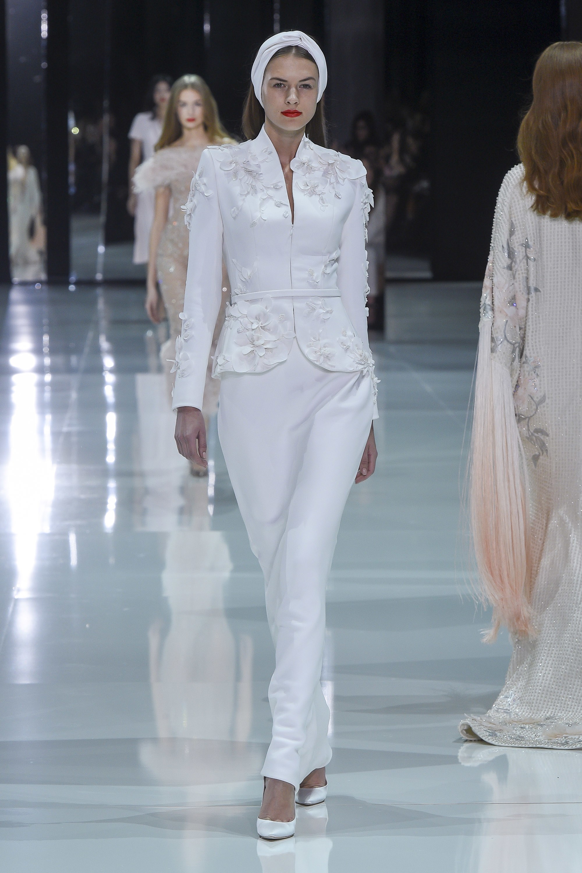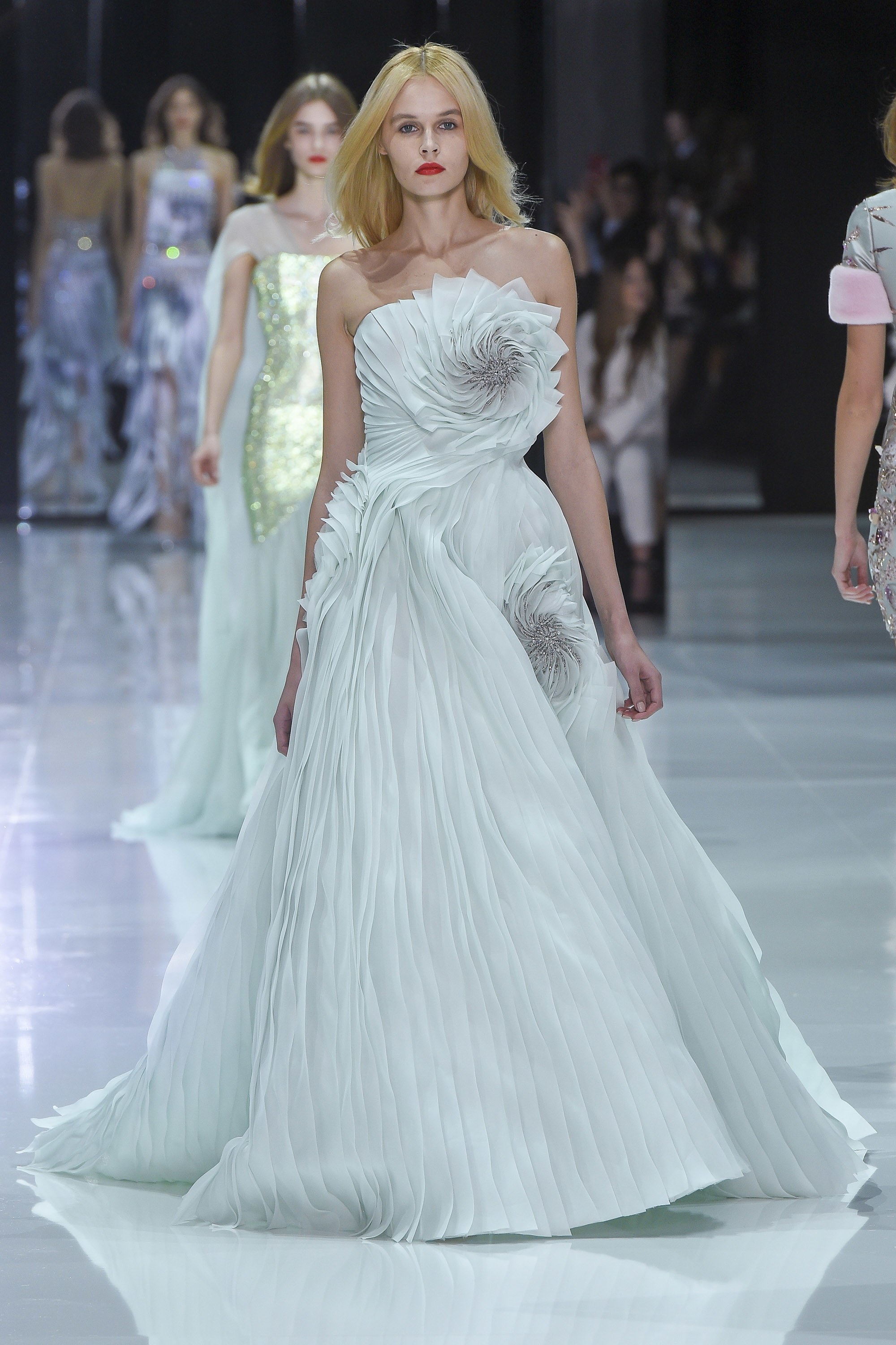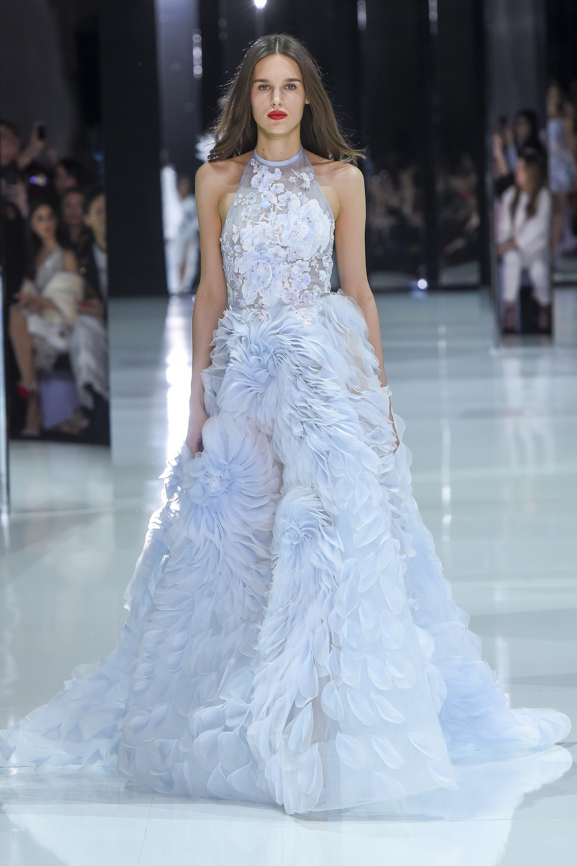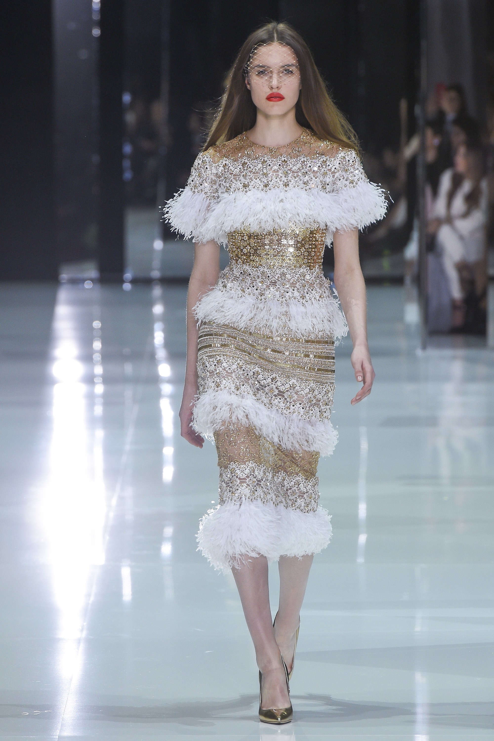 The Paris Haute Couture runway saw a mix of frothy mint organza, sugary pink silk gazar and ice blue Chantilly lace, and bombshell gowns in black velvet and metallic satin. Signature sleeves unless made from fine-spun silk fringing and coats decorated with ostrich feathers or sheer tulle added the rich opulence it deserves. The collection largely looks to the east for inspiration, evident in the embroider techniques, cluster of pearls and unique silhouettes. Known for their larger than life fantasies, the finale bridal gown presented by fashion influencer Camilla Coelho, was a 12ft wide across number with a train and veil that stretched back easily twice as far. The draped bodice and skirt were embroidered with 3D Swarovski jeweled leaves, pearlescent micro-beads and silk floss flowers which reflected at every movement.