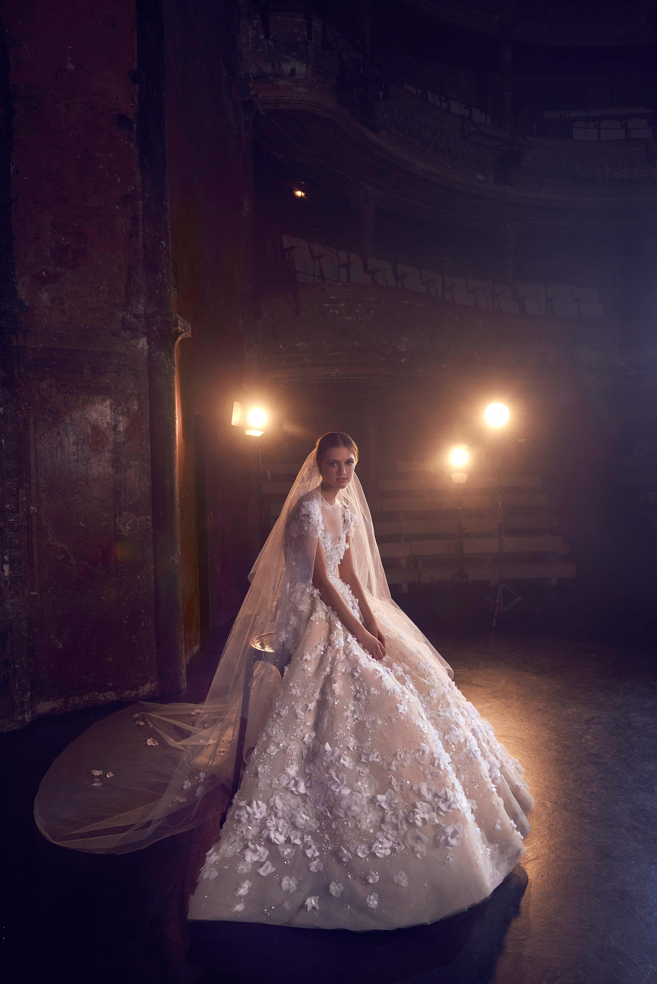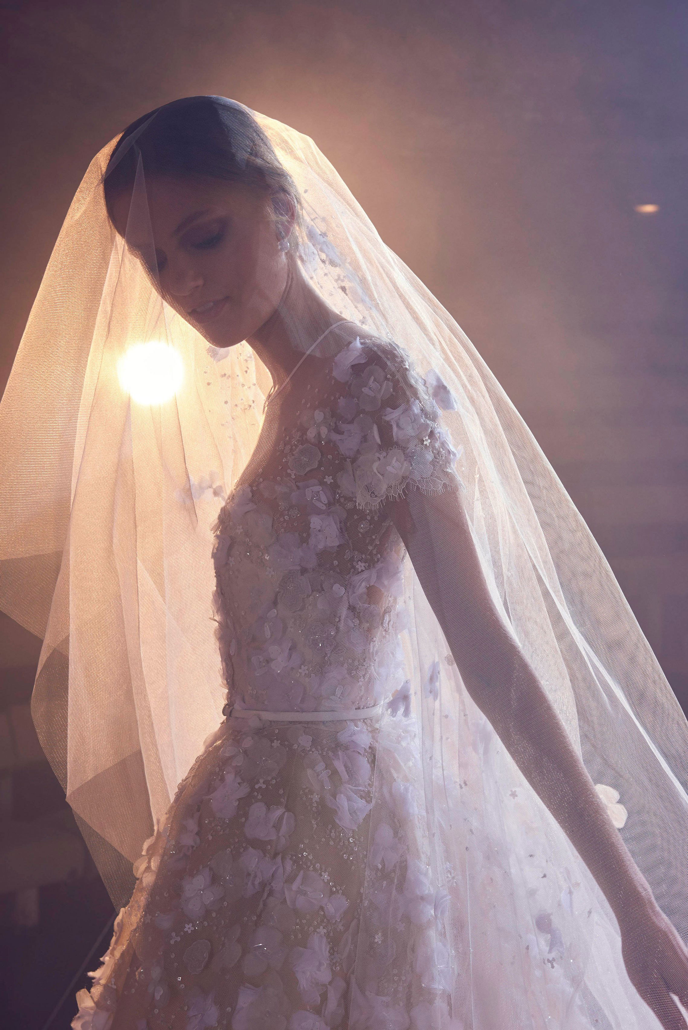 Elie Saab’s Fall 2018 focussed their attention to the most overlooked bridal accessory—the veil. After a series of royal weddings around the world put their own unique twists to the traditional veil, the Lebanese couturier featured elegant veils with modern intricacies to complement and uplift the bridal collection featuring 3D embellished gowns. Using gold and silver metallic threads for added dramatic effect and a touch of colour to each dress, Elie enhanced the ethereal quality of the embroidery by pairing these with a hooded cape, a headband veil acting as the ideal equipments for these magical, couture-like creations in their own right, which will appeal to brides of all tastes. The floor sweeping chattily lace and delicate tulle fabrics are playfully modern with a traditional charm.