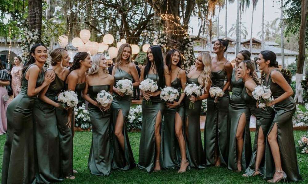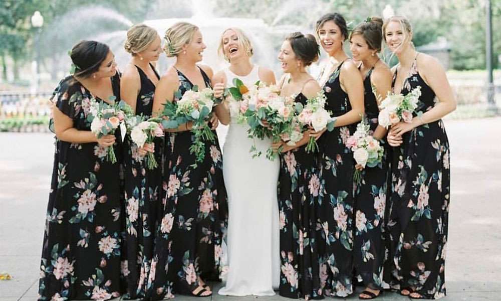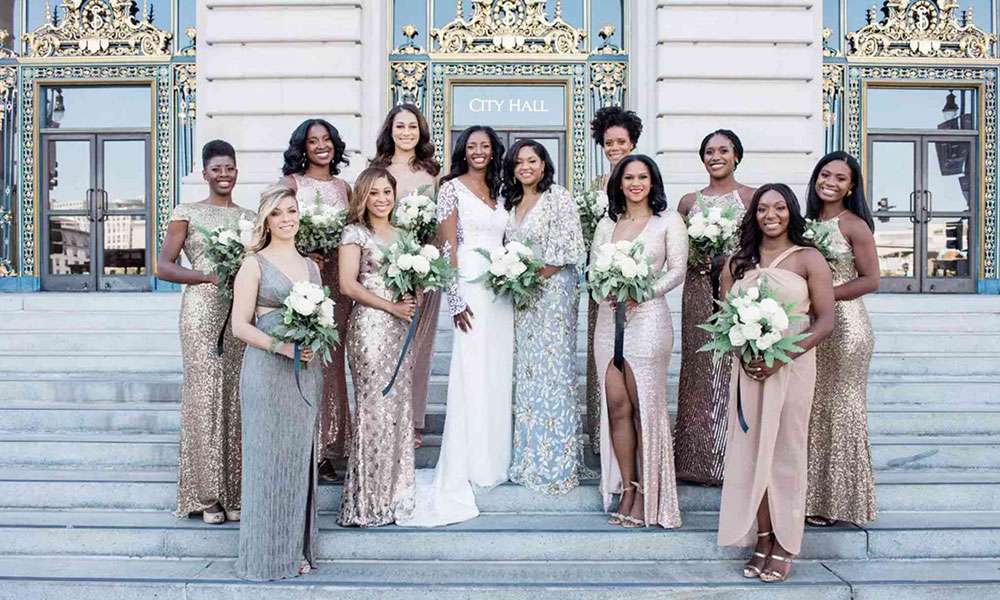 What’s more glamourous than a bridal party wearing sparkly frocks? Nothing! Mismatched sequined neutrals create a glam look with a vintage touch. Sequin bridesmaid dresses look stunning year-round, but especially at fall and winter weddings. They lend a sense of elegance and opulence that simply can’t be beaten. So embrace this Hollywood glamour trend and let your dress pop!