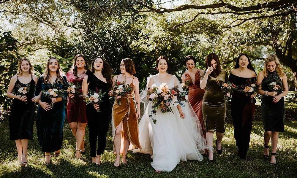 While velvet dresses could work year-round, they’re particularly perfect for fall or winter celebrations. You could have your bridesmaids in matching velvet dresses, mix colors and styles in the same fabric, or even throw in a velvet dress or two among different fabrics to add some texture to a mismatched bridal party look.