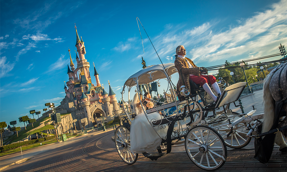 The magic doesn’t end with décor! Add unique Disney entertainment to your wedding event for a celebration to remember. Depart from your ceremony in a horse drawn carriage like a true princess, or project custom Disney movie scenes and images on your wedding cake, or host your wedding inside a Disney theme park for an incredible immersive experience. From Disney parks, movies and characters the wedding inspiration is limitless! Dazzle your guests by hosting your wedding celebration at Disneyland® Paris, a unique place where magic and love come together in the most enchanting setting. No matter how grand your wishes, largest venues in the Parks or Resort can host up to 1000 guests and are totally customizable. You can even enjoy an exclusive use of Disney® Parks after opening hours. Picture this: as night falls, experience a festive evening of attractions, dining, spectacular shows and dance late into the night! The only limit is your imagination, with an infinity of themes and locations to choose from: a Lion King extravaganza or a Royal Beauty and the Beast reception.